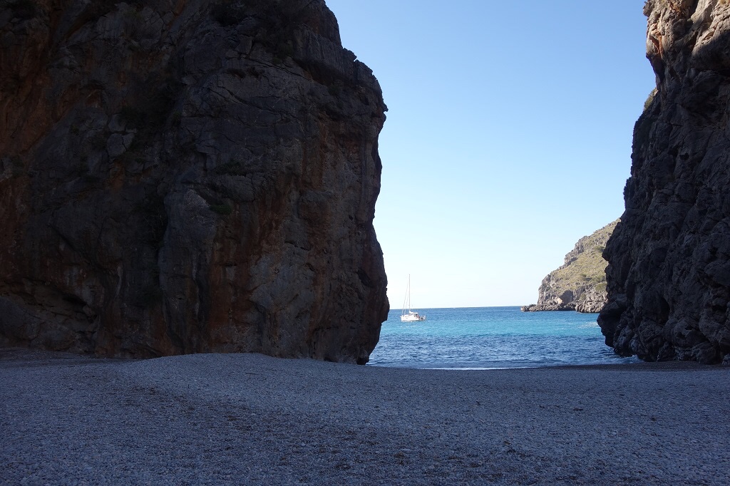 O lugar de Sa Calobra não é menos espectacular. Caminhando pela promenade, depois de um túnel chegamos ao ponto onde o Torrent de Pareis se junta ao Mediterrâneo logo após romper duramente as falésias. Então, duas paredes rochosas de altura respeitosa formam uma pequena praia – de areia – que deixa muito espaço para trás ao longo do canyon. Tem cerca de três quilómetros, mas vale a pena caminhar umas centenas de metros por ele para se sentir a dimensão do fenómeno que se foi formando há milhares de anos.