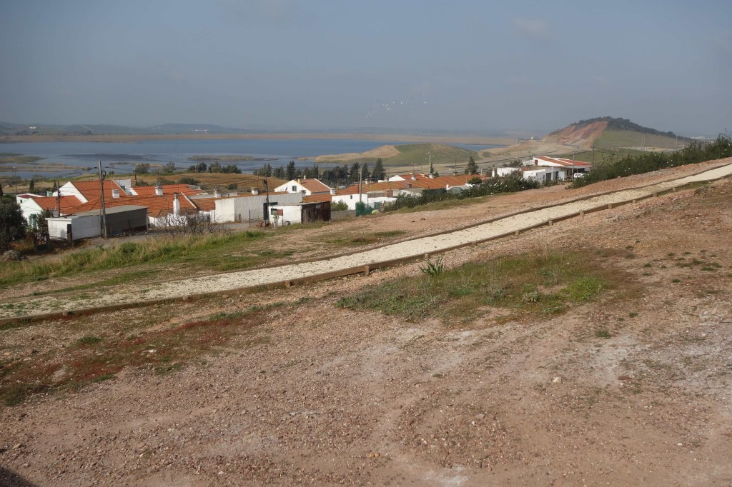 O edifício do futuro centro de acolhimento que há de abrir (espera-se) em breve fará no futuro um melhor enquadramento do sítio. Por enquanto resta-nos a vista do seu terraço, que dá directamente para o imenso buraco da mina onde se distingue a Chaminé da Transtagana, a estrutura onde se procedia à queima do minério a céu aberto. Por vezes, visitas guiadas descem ao subsolo até às galerias da mina.