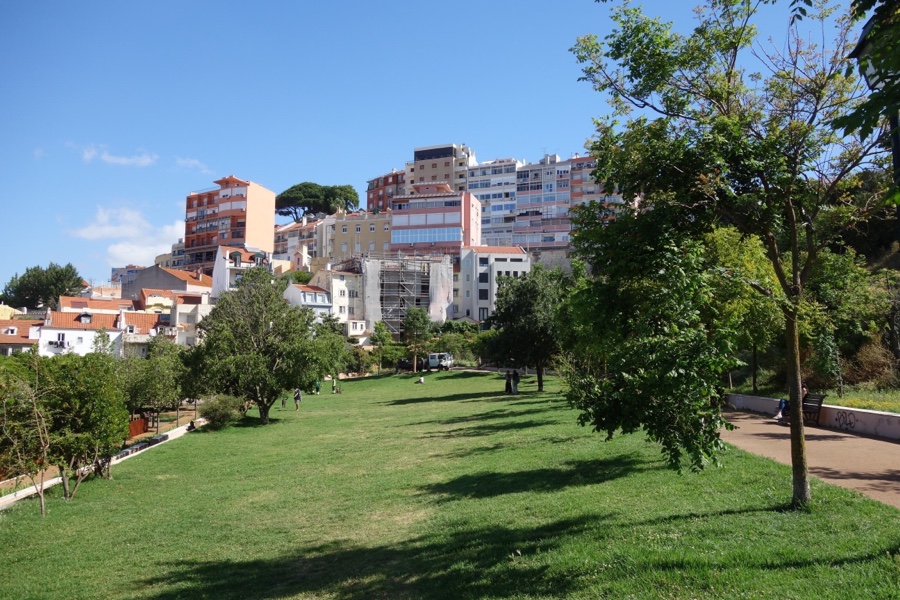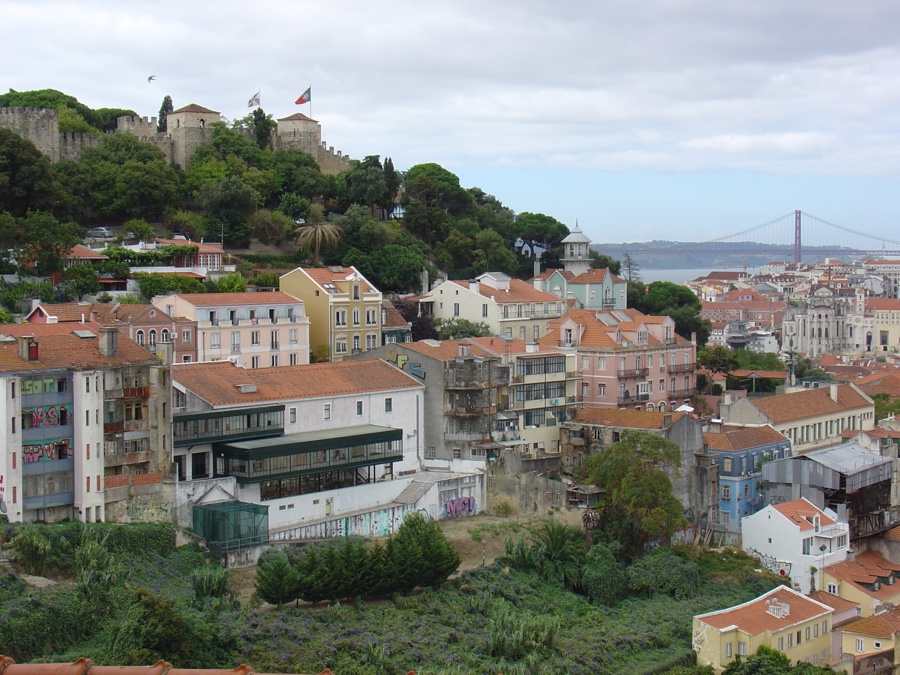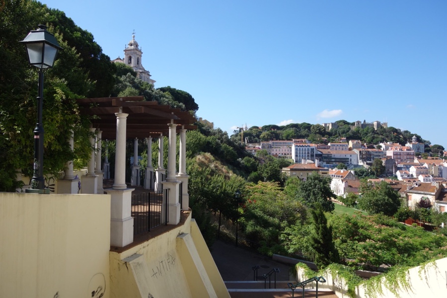 Na vertente contrária, no cimo de uma das colinas mais visitadas da cidade ergue-se dominador o Castelo de São Jorge, também a pretender esconder-se atrás de algo, desta vez de uma imensa fileira de árvores. Uma das surpresas deste jardim é percebermos como pode ser verde e cheio de vegetação o centro histórico de Lisboa.