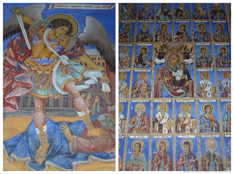 A Torre Hreliova, com 24 metros altura e em pedra, é a estrutura mais antiga do complexo, construída em 1335. Ao seu lado, também no meio do pátio, está a Igreja da Natividade, construída entre 1834-37. Nela o destaque vai em absoluto para os super coloridos frescos exteriores representando cenas da Bíblia, as glórias do céu e os horrores do inferno que esperam os pecadores. Já havia tido a oportunidade de ver cenário semelhante nas igrejas pintadas de Bucovina, na vizinha Roménia, mas o espanto e felicidade perante tamanha explosão de cor e arte em Rila não foram menores. O interior é muito escuro e estava em restauro, mas deu para perceber seu enorme candelabro.