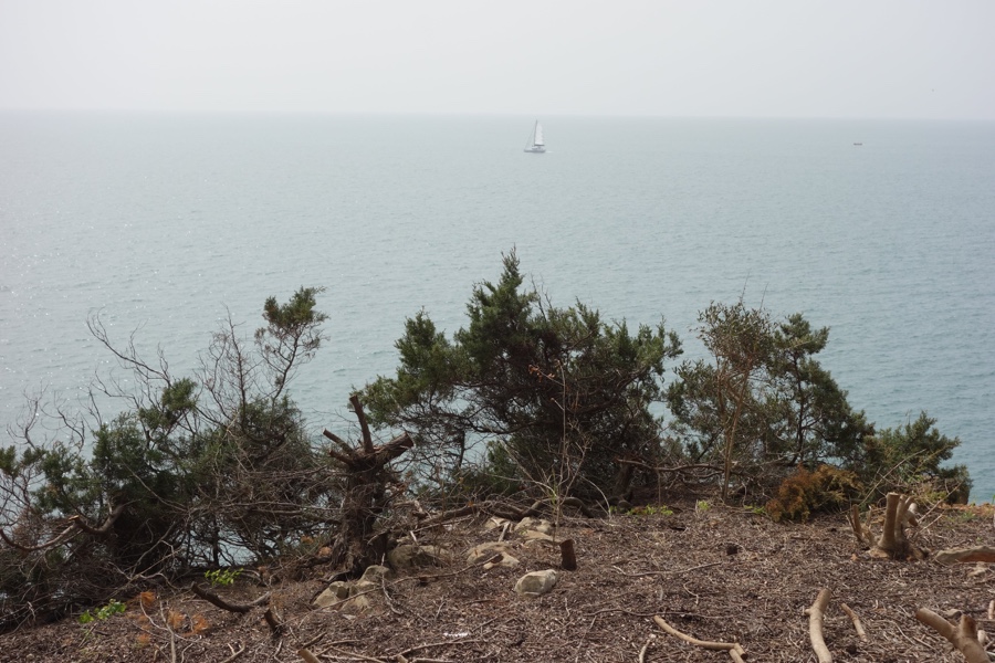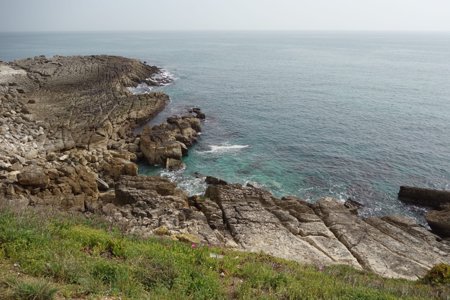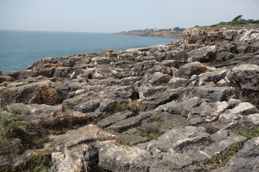 Saindo, então, do Cabo Raso passamos pelas ruínas de antigos viveiros de marisco e por algumas reentrâncias e enseadas na costa com baías estreitas pelo meio. O que mais surpreende, no entanto, é a rudeza da rocha e da laje escuras, formando interessantes plataformas calcárias, fendas, covas e grutas. A vegetação é rasteira, mas consegue ser algo florida. Aqui marcam presença o funcho marítimo, a raiz divina, a sabina e o zimbro da praia. O vento e ondulação fortes, elementos da casa, não deixam que haja vegetação de grande porte, embora aqui e ali um pinheiro ou outra árvore maior tente vingar, a custo de ver os seus troncos retorcidos.