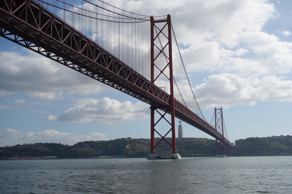 A Ponte 25 de Abril está cada vez mais perto, até que passamos mesmo sob esta estrutura, mais um símbolo de Lisboa. Inaugurada em 1966, é uma das mais bonitas d maiores pontes suspensas do mundo e o seu tabuleiro com 2277 metros comprimento liga a capital a Almada. O barulho debaixo dela é intenso, e não tão memorável de ouvir como aquele que sentimos ao conduzir sobre a grelha metálica do tabuleiro rodoviário – sim, desde pequenas somos fãs e, sem medo, sempre insistíamos com o pai que seguisse por ela sem desvios a caminho das praias da Caparica.