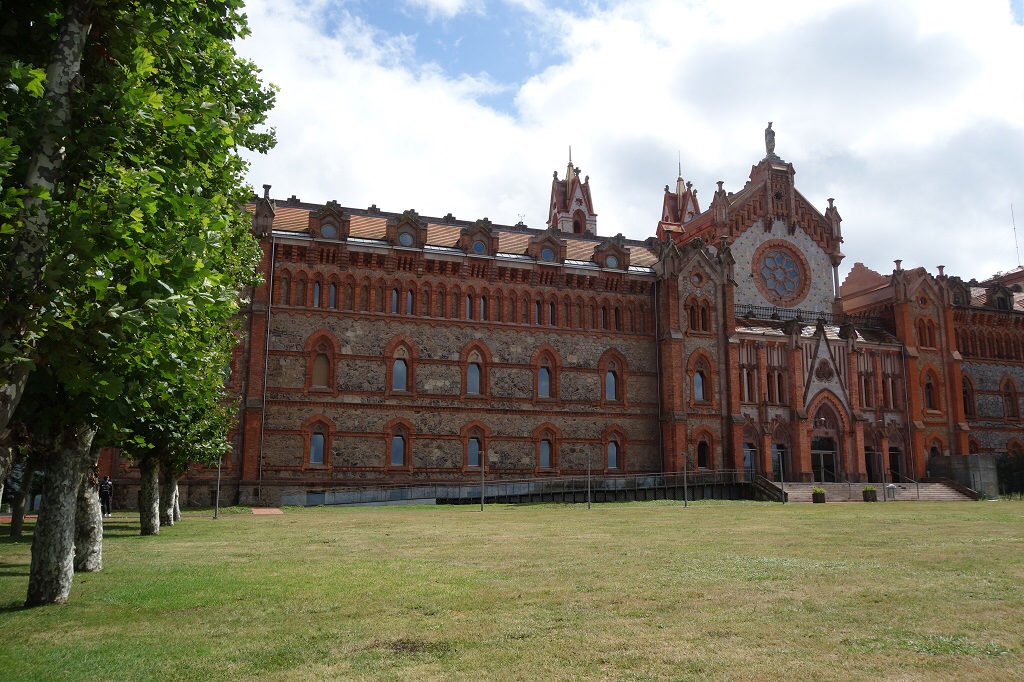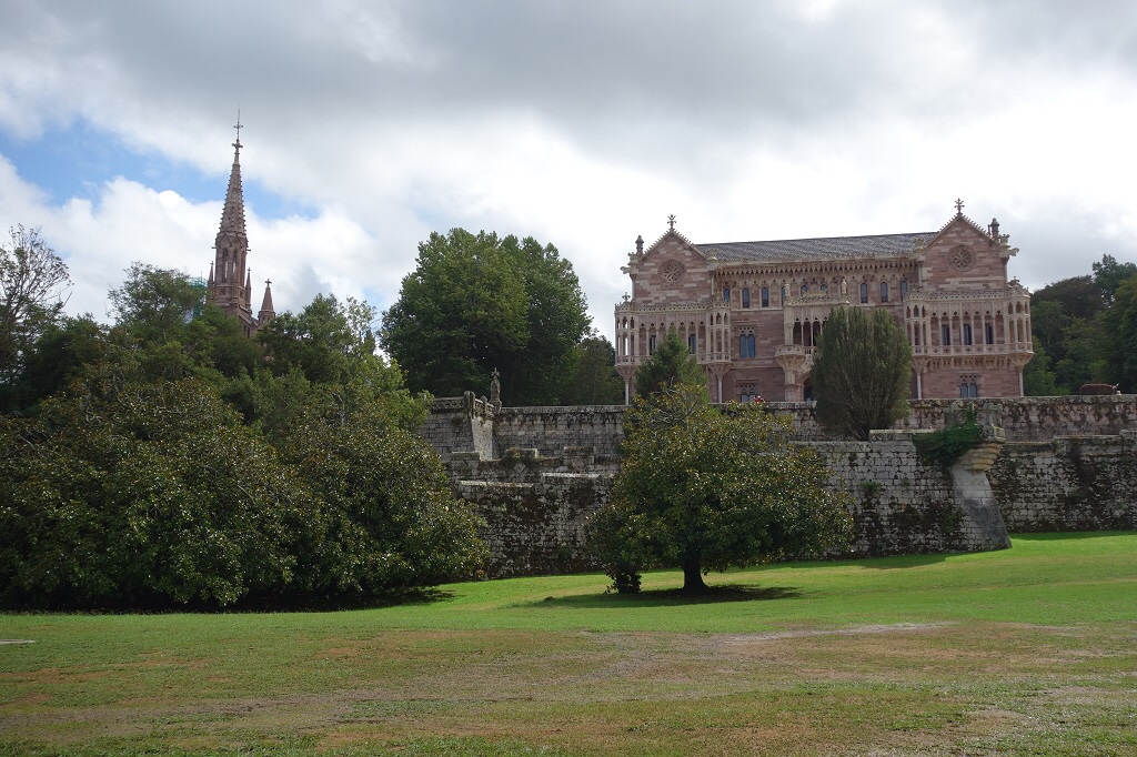 Numa outra colina, o Seminário Mayor de Comillas / Universidade Pontifícia troca o azul do mar, apesar de também não andar longe, pelo verde da relva e da vegetação. A porta de acesso à finca (quinta) de la Cardosa, onde está instalado, é mais um momento de folia arquitectónica, um conjunto em vermelho que mescla tijolo e cerâmica com o escudo esculpido em pedra com a tiara e as chaves pontifícias dos jesuítas, conjunto de influência gótica e oriental.
