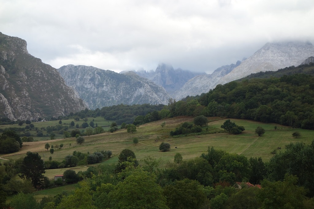 Dado o mau tempo que se estava a instalar, com céu muito nublado, acabámos por não seguir até Fuente Dé, onde está o teleférico que leva até ao miradouro do Cabo, a 1800 metros de altitude, superando um desnível de mais de 700 metros em poucos minutos. Diz que as vistas para o maciço central são fantásticas e das mais emblemáticas dos Picos da Europa, mas teremos de o confirmar numa outra visita. É por aqui que fica o Torrecerredo, o mais alto deles, com 2648 metros de altitude, e o Urriellu, mais conhecido por Naranjo de Bulnes, o mais famoso e admirado deles, com 2519 metros de altitude. O nome “naranjo” deve-se ao facto de ao entardecer tomar um tom alaranjado, tornando este já de si elegante monólito uma beleza ainda maior. Foi desde o miradouro Póo de Cabrales, na vertente contrária, a norte, que o pudemos apreciar por segundos algo liberto das suas costumeiras companheiras nuvens.