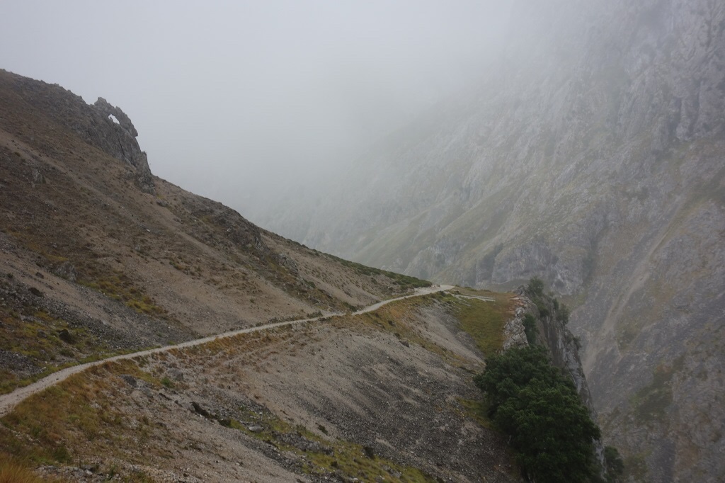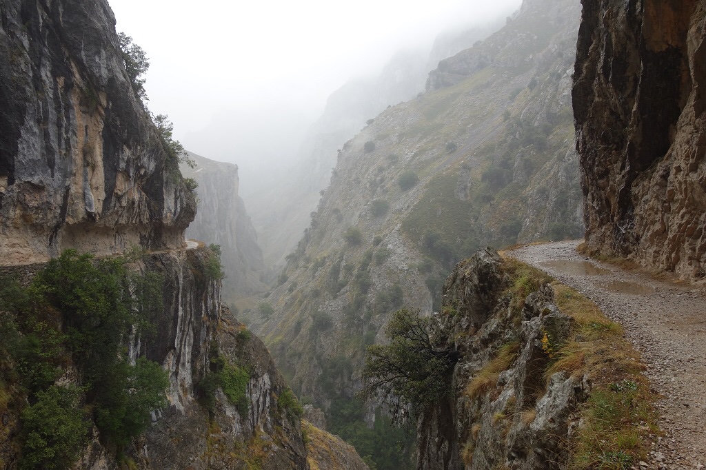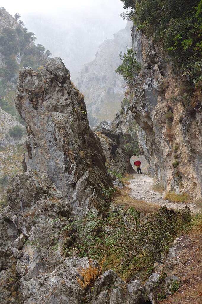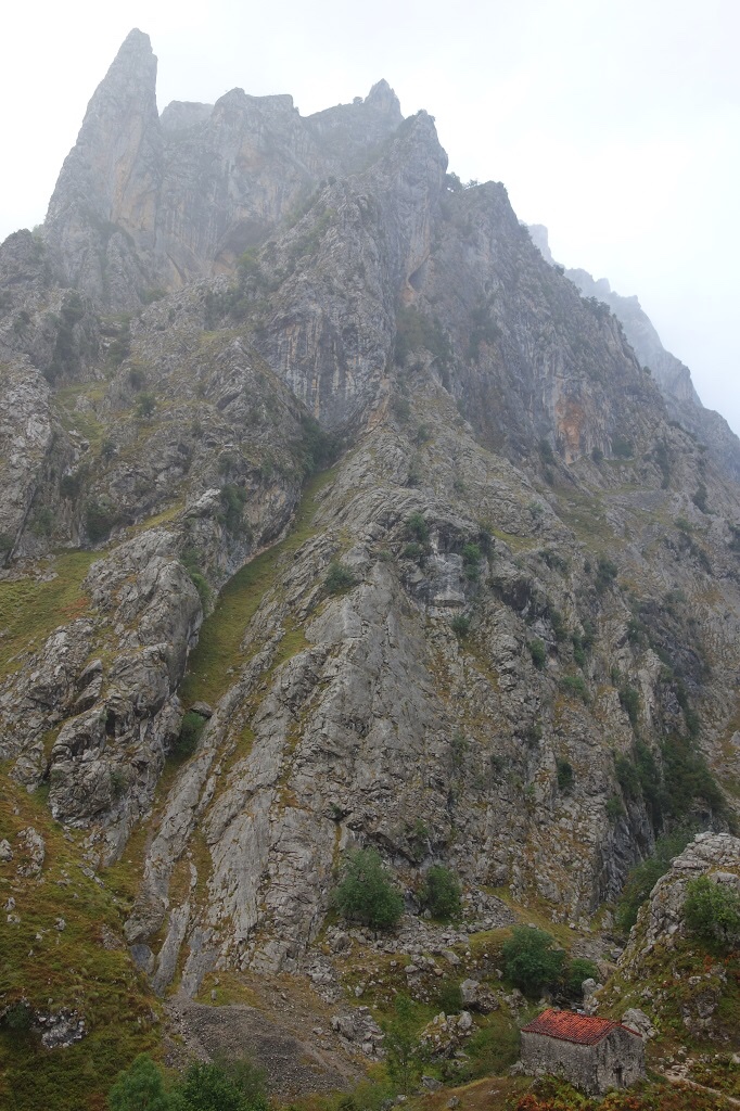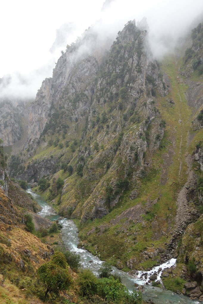 Já desde Arenas de Cabrales, a 6 kms, que vínhamos a ser acompanhados na estrada pelo estreito rio, uma espécie de preparação para o que nos esperaria no dia seguinte. Apesar de ser Agosto, o clima chuvoso e nublado não ajudou a domar a ansiedade de quem não está habituado à montanha e seus humores, mas a verdade é que a chuva leve mas persistente e, sobretudo, o céu cinzento até deram um ar místico à jornada.