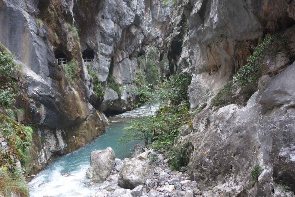 Dizem muitos que este é um trilho fácil, quase sempre plano e, sim, é fácil, mas apenas para aqueles que estão habituados a caminhar quer em distância quer em diversos tipos de piso. Isto porque, na verdade, os primeiros 2,5 kms da rota até ao lugar denominado Collaos são sempre a subir e a calcar pedras. Depois, sim, é efectivamente quase sempre plano e, como é largo, nem a chuva traz grande perigo de escorregar e nos abeirarmos demasiado dos enormes precipícios que dão verticalmente para as águas do Cares, que correm quase sempre bem lá em baixo, num caminho fluvial apertado pelas paredes rochosas.