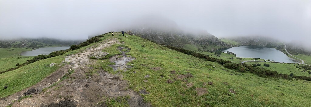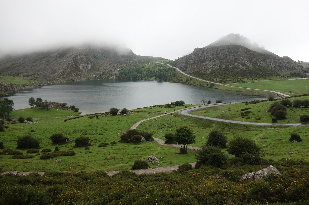 O miradouro de La Picota, ou Entrelagos, oferece uma panorâmica conjunta dos dois lagos, o referido Ercina e o Enol. Este tem uma casinha à sua beira e mais um par delas pouco mais longe, mas são os contornos da estrada que, vistos de um plano superior, dão uma piada extra à imagem. É tudo tão verde e tranquilo, quer nas margens dos lagos quer na sua envolvente, que sentimos pena de não ter podido apreciar o cenário com um clima mais simpático. E, também, de não ter parado na estrada – o autocarro segue directo do Santuário até aos Lagos – para conhecer a vista desde os miradouros de la Reina e de los Canónigos. Quem sabe se de uma próxima vez não nos atrevemos a subir de bicicleta, qual heróis da Vuelta, que costuma ter passagem por aqui?