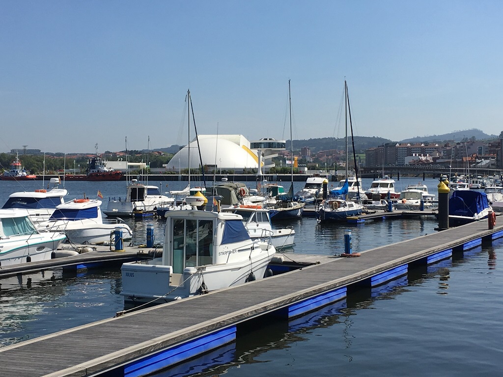 Depois de apreciados todos os pormenores deste Centro Niemeyer, que acolhe exposições e actividades artísticas, atravessamos a colorida ponte sobre a ria. Poderíamos ter atravessado uma outra ponte e percorrido parte do seu passeio fluvial até ao porto recreativo, onde estão os seus barquinhos e veleiros. Mas optámos pela ponte colorida e, depois, por atravessar nova ponte, desta vez a passarela conhecida por “La Grapona”, precisamente em forma de gancho e sobre a linha comboio e a movimentada estrada. Uma bela ideia de ligar o novo ao antigo e, assim, chegamos ao centro histórico de Avilés.