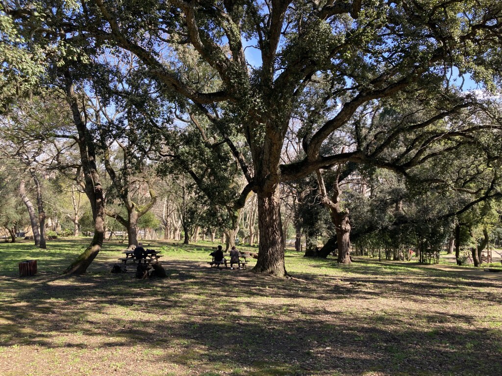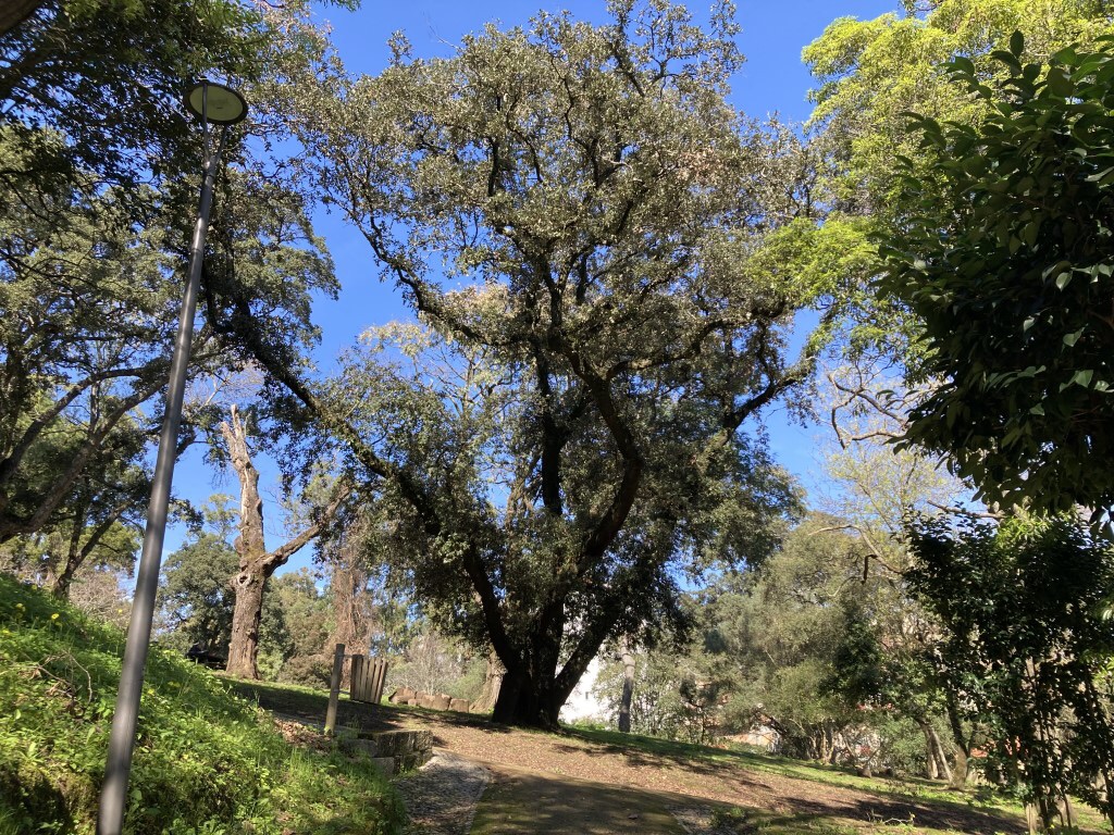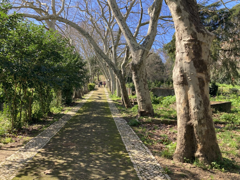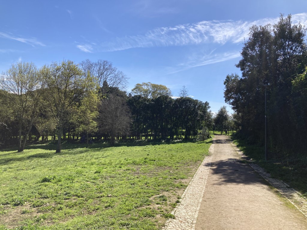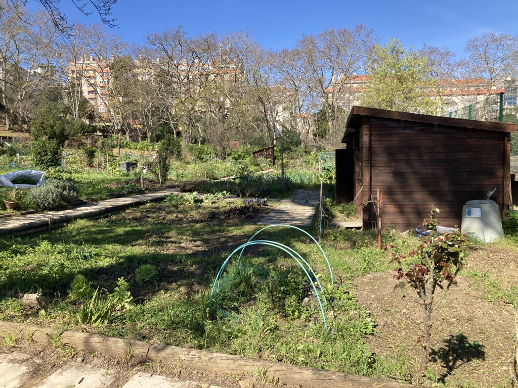 Ao entrar no Parque Bensaude pela entrada da Estrada da Luz, caminhamos por uma “avenida” com árvores e hortas comunitárias à direita, parte do Parque Hortícola Bensaúde, criado em 2013, com vários talhões para agricultura urbana.