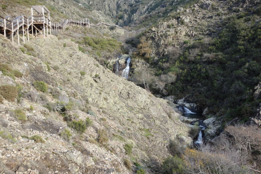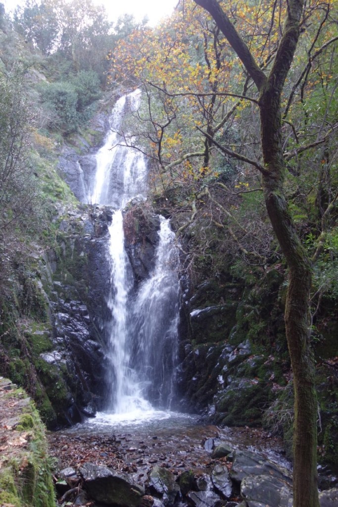 A base da cascata, pouco abaixo mas não fácil de alcançar, já se disse, é uma beleza, uma torrente forte com cerca de 25 metros de altura distribuída por mais do que um patamar, totalmente inesperada e acompanhada pelo ambiente místico de bosque por onde segue a ribeira. A Serra da Lousã é rica em biodiversidade, incluída na Rede Natura 2000, um mundo natural onde habitam espécies como veados vermelhos, corços, javalis, raposas, doninhas, ginetas, coelhos, lebres e lontras, para além de diversas aves como açores, águias-de-asa-redonda, melro-d’água, dom-fafe, petinha dos campos, corujas e mochos. Tudo isto num coberto vegetal tipicamente mediterrâneo, composto por carvalho cerquinho, sobreiros, castanheiros, medronheiros, urzes, carquejas, tojos e giestas, bem como pinheiro bravo, pinheiro silvestre, eucalipto, cedro-do-Buçaco e cedro-do-Atlas.
