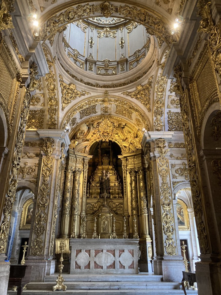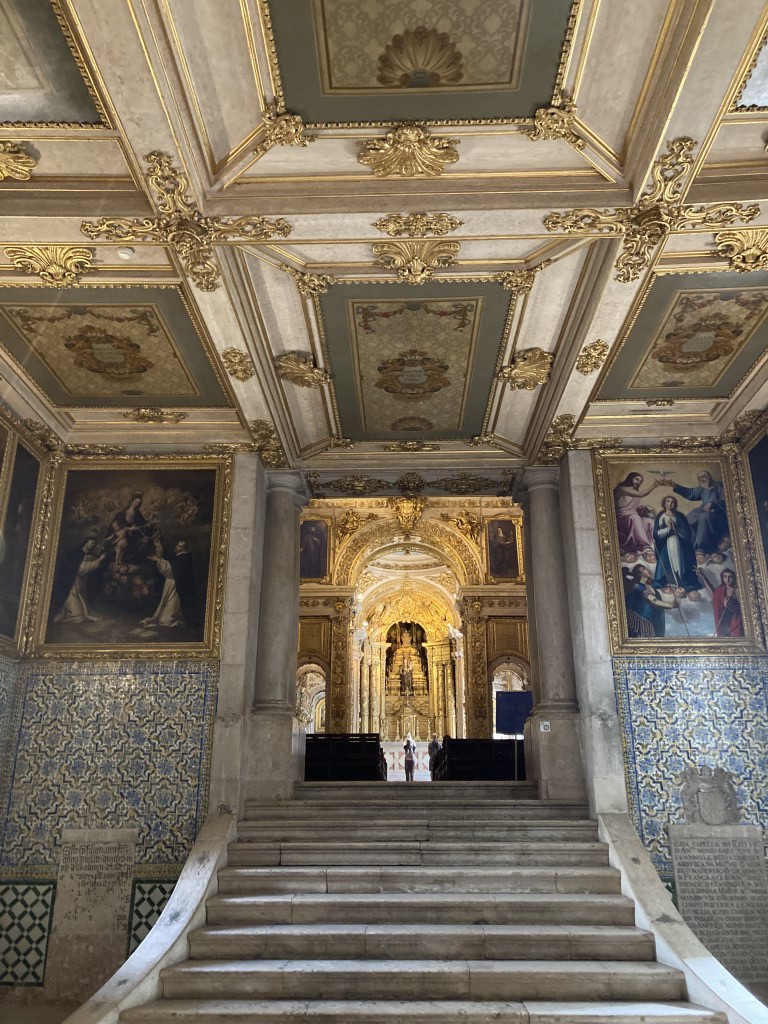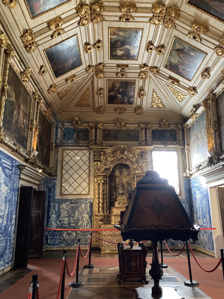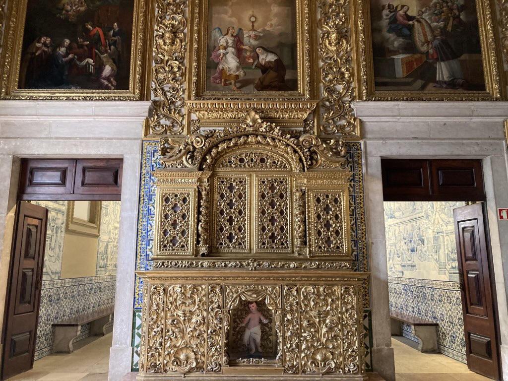 Antes havíamos passado pela Sala do Capítulo, que antecede a igreja, igualmente com muita talha dourada, seja na moldura das pinturas, no retábulo ou nos altares laterais, um dedicado à morte de Cristo e outro a Nossa Senhora da Boa Morte, ambos do século 18 e que terão estado ou na capela mor ou na sacristia.
