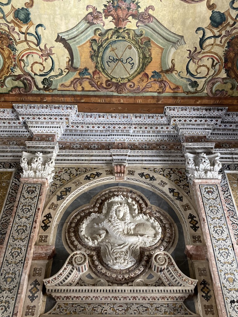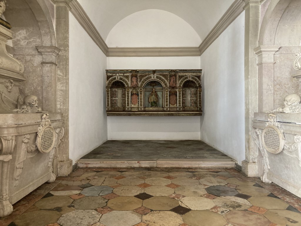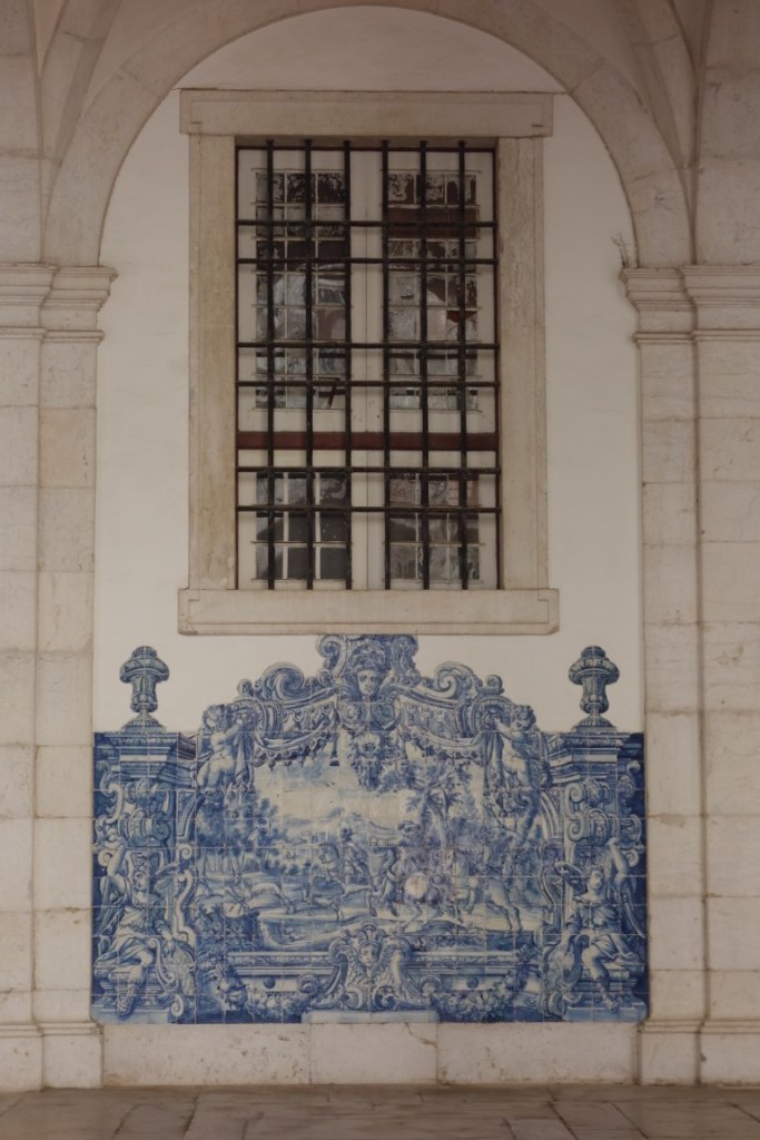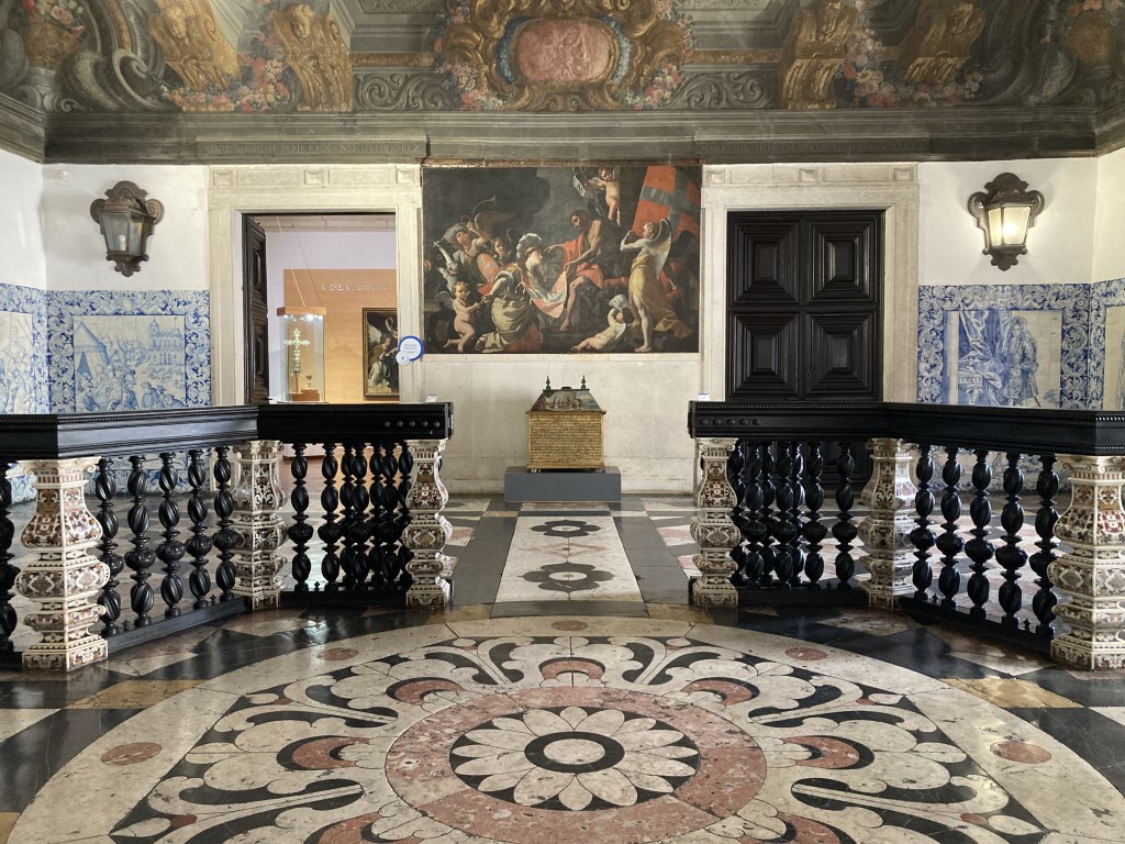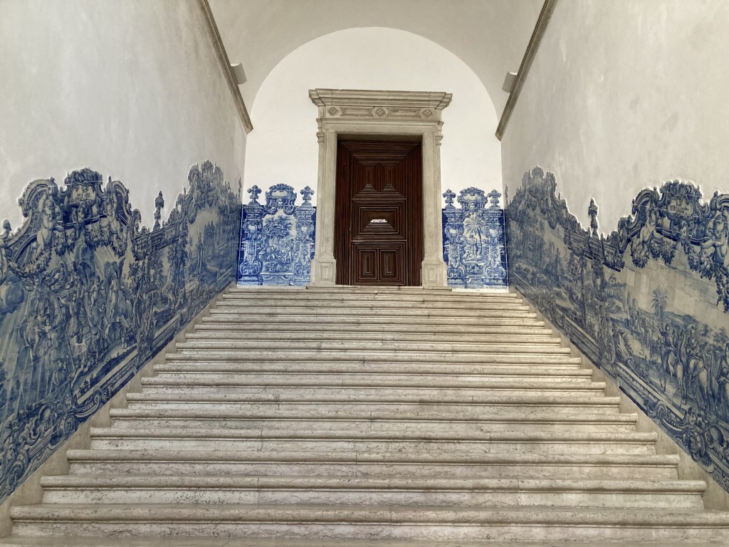 Iniciemos a visita pela portaria, a sala mais impressionante do convento. Esta era a sua entrada nobre, onde eram recebidos os convidados mais ilustres. Durante o reinado de D. João V, foi ricamente decorada com azulejos, pinturas e embutidos no pavimento, atribuindo-lhe o carácter faustoso e de grande aparato que ainda hoje podemos testemunhar. A pintura mural do tecto rouba as atenções, obra do florentino Vincenzo Baccarelli, datada de 1710, representando o “Triunfo de Santo Agostinho sobre a Heresia”. Foi ele quem introduziu no nosso país a técnica “trompe l’ oeil” (enganar o olho), em que de forma ilusória se ampliam os espaços através de pinturas de arquitecturas perspectivadas. Esta pintura é uma das poucas a terem sobrevivido ao Terramoto de 1755. Mas nesta sala, que no início do século 20 foi transformada em capela, há ainda que apreciar os azulejos que revestem as paredes. Para além da função decorativa, serviram para expressar uma narrativa de conteúdo nacionalista, segundo a qual a dinastia de Bragança procurava sobrepor-se em relação à antecedente, a Filipina, na sequência da Restauração de 1640 – esta é, pois, uma sala que celebra a volta de Portugal aos portugueses. Os painéis azulejares representam aqui três grandes temas: os cónegos regrantes do mosteiro de Santa Cruz de Coimbra a colaborar com o primeiro rei de Portugal, os grandes feitos de Afonso Henriques e demais reis relacionados com o mosteiro.