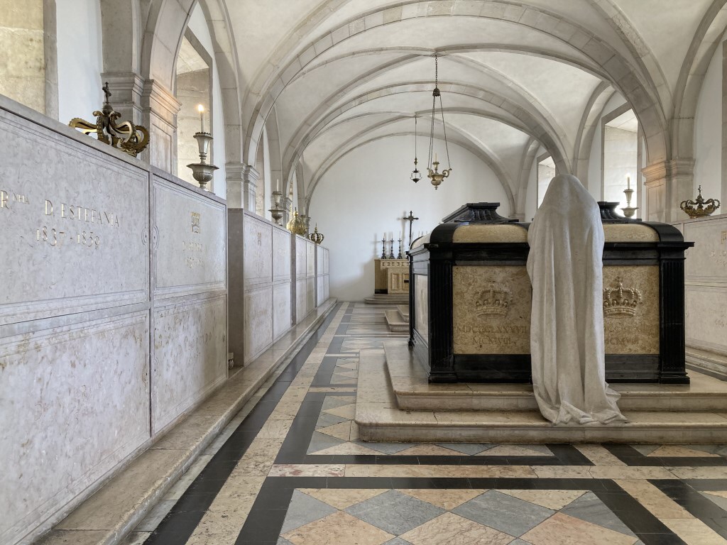 O Panteão Real dos Bragança é mais imponente. D. João IV, fundador da dinastia, havia escolhido este mosteiro para acolher o panteão da família, como forma de reafirmar a legitimidade ao trono, associando-se ao fundador do reino e fundador do mosteiro. O panteão estava, assim, na Igreja, mas em 1854, após a morte de D. Maria II, o seu marido D. Fernando de Saxe-Coburgo decidiu passar o panteão para o espaço que até à extinção das ordens religiosas, em 1834, havia funcionado como refeitório do mosteiro. Todavia, o que hoje visitamos é o resultado de obra efectuada durante a década de 1930 (Estado Novo), sob projecto de Raul Lino. À entrada do panteão vemos a imagem da padroeira de Portugal, Nossa Senhora da Conceição, também símbolo da Casa de Bragança. E ao centro e em destaque, túmulos de elementos da última família real portuguesa, bem como a escultura “Dor”, de Francisco Franco, representando uma figura feminina que chora as mortes de D. Carlos e do príncipe D. Filipe, na sequência do regicídio em 1908.