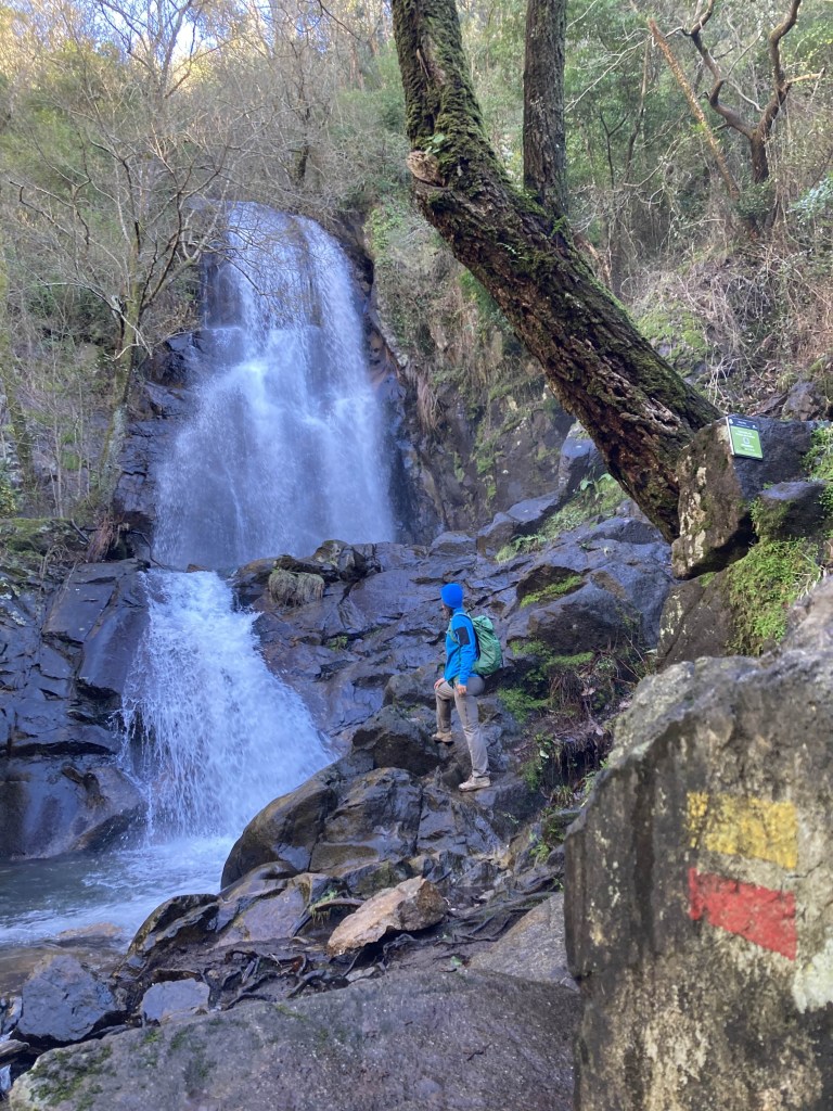 A cascata faz-se ouvir à sua aproximação. Diante dela o estrondo não é apenas sonoro, mas também visual. São 32 metros de altura de abundante queda de água (a nossa visita aconteceu no mês de Fevereiro, mas diz que a água não pára nunca de cair). Duas piscinas naturais, em dois patamares diferentes, formam-se na base na cascata da Pedra Ferida. O curioso nome vem do oxigénio da água sobre as pedras que, ricas em ferro, alteram a sua cor em resultado da oxidação. Aliás, a cor tem aqui um novo e contrastante elemento, com o branco da espuma a acrescer ao negro da pedra e ao verde da vegetação.