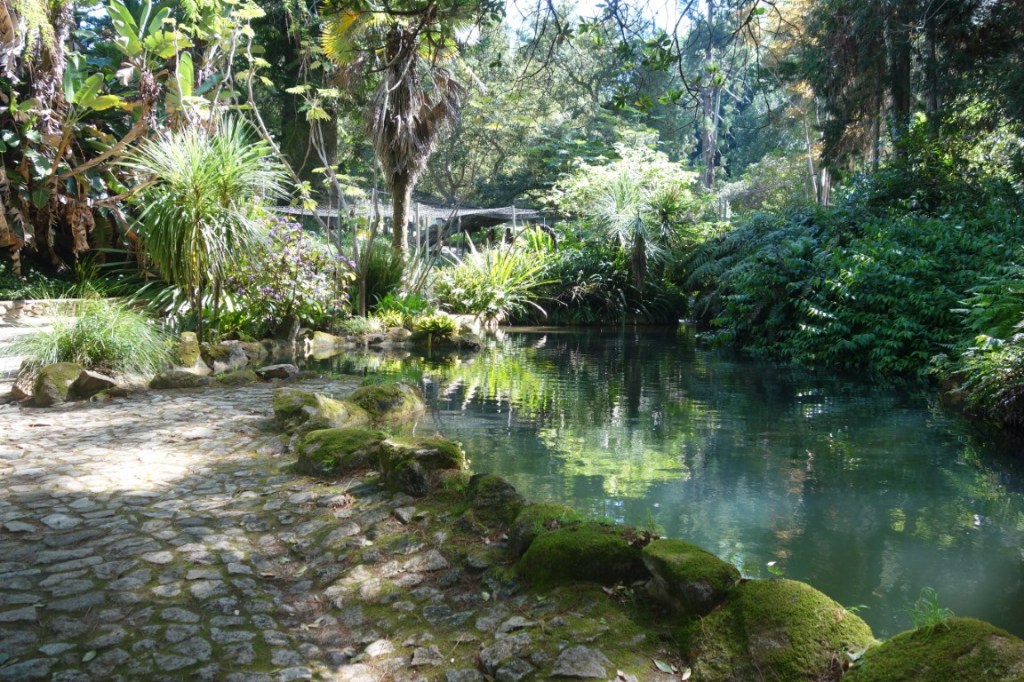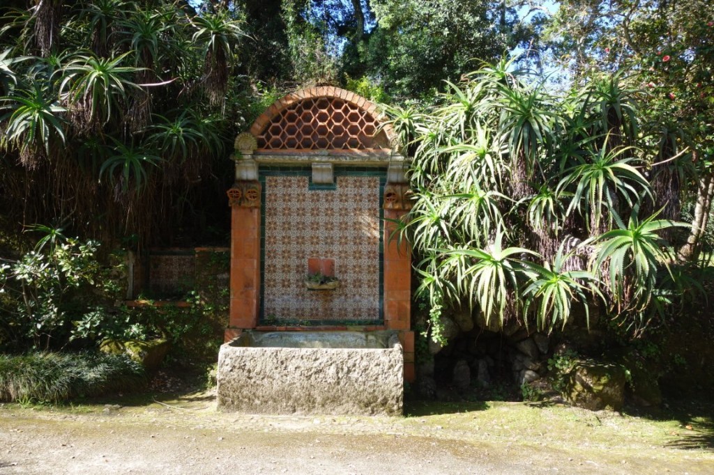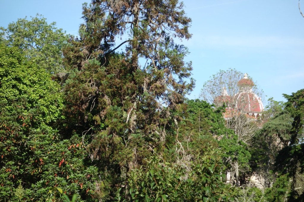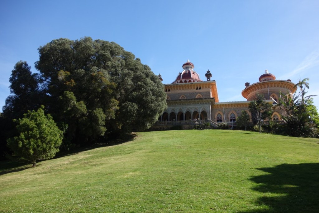 À entrada do Parque de Monserrate, encaminhamo-nos para o seu palácio, mas logo ficando totalmente envolvidos pela exuberante vegetação. Passamos por uma das várias minas de água (túneis escavados no subsolo por forma a aproveitar a água aqui existente em abundância, através de um sistema de condução da água por gravidade), por vários afloramentos rochosos (mais e mais poderosos se seguirão na outra vertente do parque) e pelo cromeleque (mandado construir por William Beckford, a designação remete para uma estrutura megalítica pré-histórica, mas desconhece-se a origem e função desta estrutura decorativa), até nos vermos junto à cafeteria do Parque e demais edifícios de apoio, como a bonita e singular Casa de Pedra, sede da Parques de Sintra. O majestoso palácio, com suas três torres circulares coroadas por cúpula, já se vislumbra.