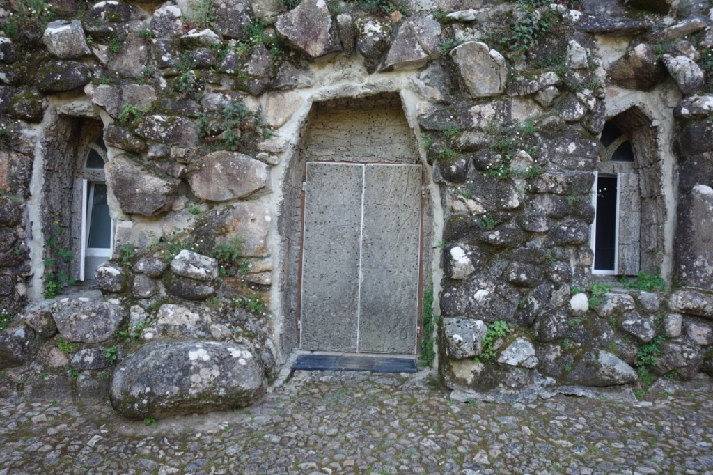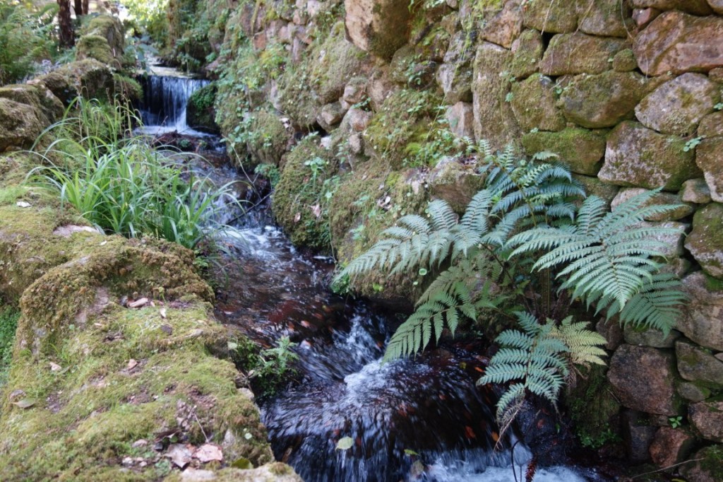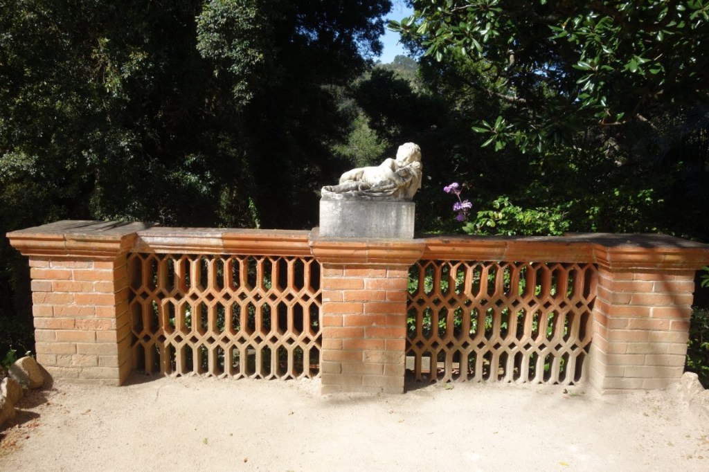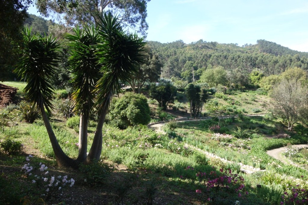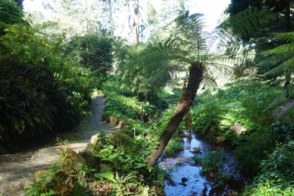 À entrada do Parque de Monserrate, encaminhamo-nos para o seu palácio, mas logo ficando totalmente envolvidos pela exuberante vegetação. Passamos por uma das várias minas de água (túneis escavados no subsolo por forma a aproveitar a água aqui existente em abundância, através de um sistema de condução da água por gravidade), por vários afloramentos rochosos (mais e mais poderosos se seguirão na outra vertente do parque) e pelo cromeleque (mandado construir por William Beckford, a designação remete para uma estrutura megalítica pré-histórica, mas desconhece-se a origem e função desta estrutura decorativa), até nos vermos junto à cafeteria do Parque e demais edifícios de apoio, como a bonita e singular Casa de Pedra, sede da Parques de Sintra. O majestoso palácio, com suas três torres circulares coroadas por cúpula, já se vislumbra.