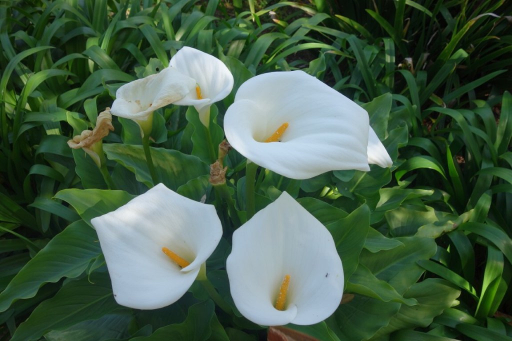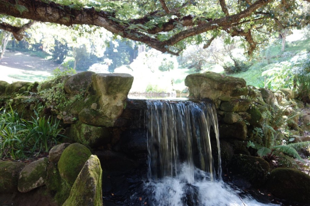 E não podiam faltar os lagos ornamentais. Artificiais, o maior está ao fundo do relvado e tem papiros, lótus e nenúfares junto à margem, e o mais pequeno tem uma cascatinha e está enquadrado pela Estrelícia-gigante, o Taxódio-do-méxico e a Búnia-búnia.