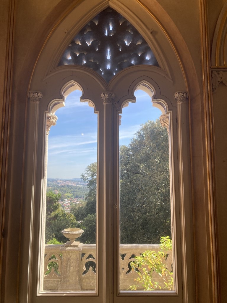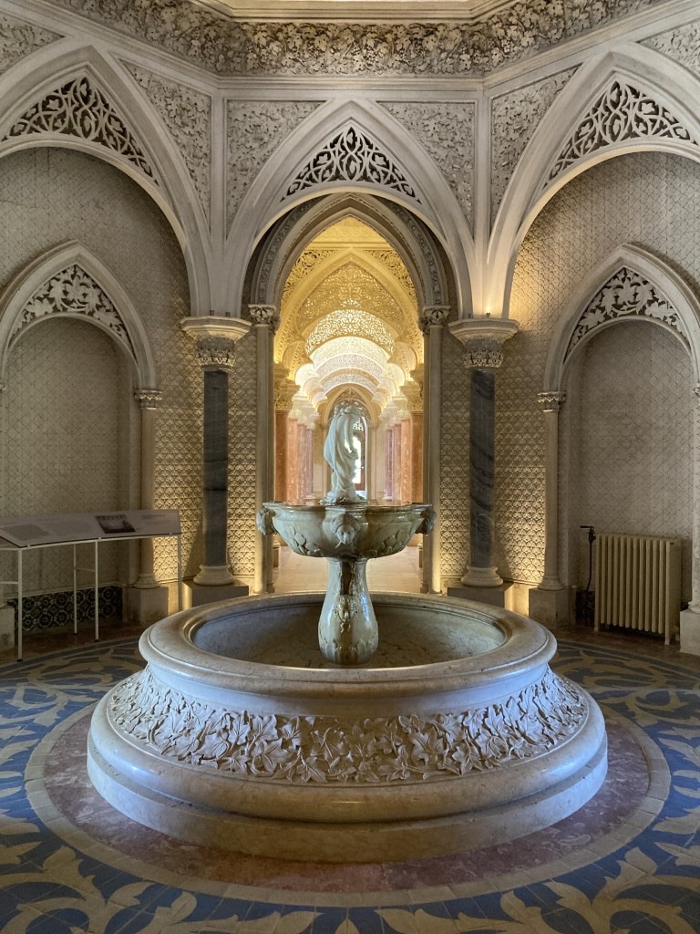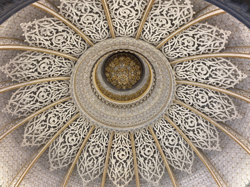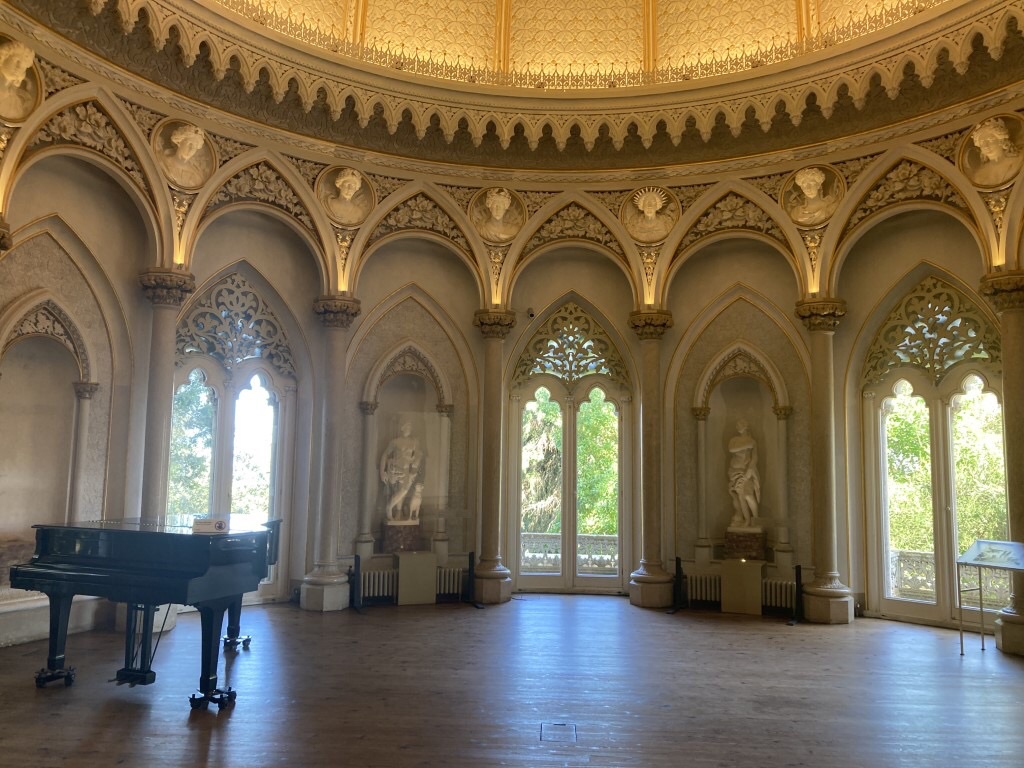 Mas há mais espaços, como a Sala de Arte Sacra (além das peças, o vitral contribuía para o carácter cenográfico de ambiente religioso), a Sala de Jantar, a Biblioteca (com paredes forradas por estantes de madeira e uma incrível porta esculpida a alto relevo), a Sala da Música (correspondente ao torreão norte, com a cúpula belamente decorada em estuque com motivos florais dourados) e a Cozinha no piso inferior. Numa frase retirada da revista Ilustração Portuguesa, de 1904, e inscrita na exposição que é apresentada no interior do palácio lê-se “é uma casa onde o bem reside numa atmosfera quase sagrada à força de ser artística”. É o romantismo no seu melhor. As janelas do interior das salas do palácio vão deixando ver a paisagem exterior, num contacto profundo e intrínseco entre os vários elementos. E é para lá que vamos agora, rumo ao relvado que nos dá a mais icónica das imagens do Palácio de Monserrate.