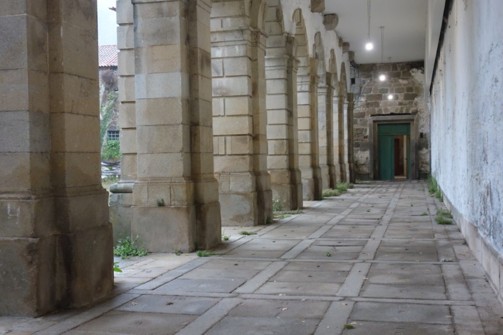 O espaço ao redor dos claustros do Mosteiro de Pombeiro é exemplar do estado a que este Monumento Nacional chegou. Durante as Invasões Francesas, em 1809, o Mosteiro sofreu graves danos, embora a igreja tenha escapado à destruição. Em sequência, os claustros foram restaurados ao estilo neoclássico, mas tal restauro acabou por ser interrompido devido à extinção das ordens religiosas, em 1834. Foi a partir daí que o Mosteiro de Pombeiro foi entrando, progressivamente, em ruína. Deste claustro resta, assim, parte da sua fachada, de dois pisos, com uma sequência de arcos ao nível do piso térreo, bem como parte do corpo principal da residência conventual. Vê-se uma fonte no meio do jardim e ficamos com curiosidade com o que estará para além dele. A um canto, restos de painéis de azulejo, deixados praticamente aos elementos. Como curiosidade final, nos últimos anos tem havido alguns trabalhos arqueológicos no lugar, os quais permitiram identificar a existência de uma fundição artesanal de sinos desde a época medieval até à época moderna. Que estes trabalhos possam continuar, assim como outros que permitam reforçar a memória da presença dos beneditinos em Pombeiro, é o que se deseja.