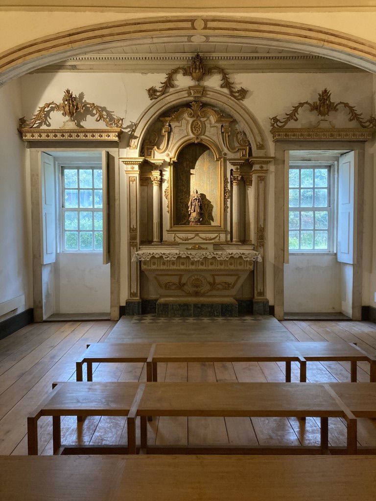 Depois de visitarmos a Sacristia, com um bonito e longo arcaz e umas telas com a representação da descida da cruz, e a biblioteca, que espera-se possa vir a ser restaurada em breve, chegamos ao Coro-alto. Nele, o cadeiral em jacarandá trabalhado faz como que uma pausa na religiosidade e, por entre diversa decoração, apresenta umas imagens femininas que parecem desnudas, obra do Frei José de Santo António Ferreira Vilaça, à semelhança do retábulo mor e de outros elementos no Mosteiro.