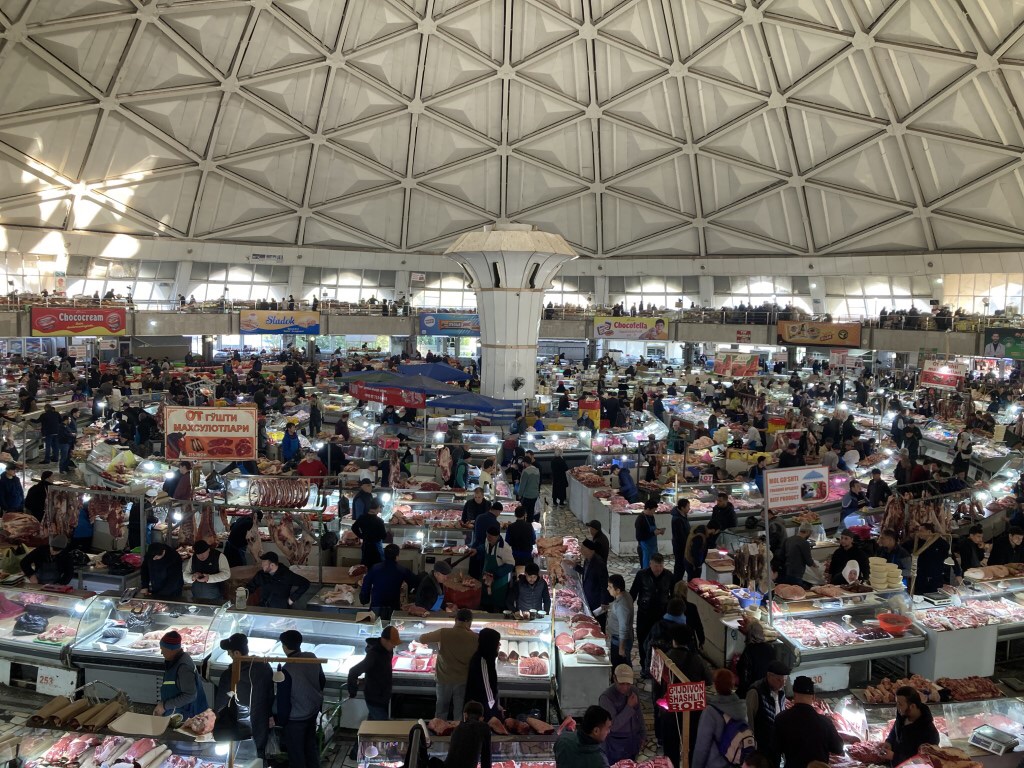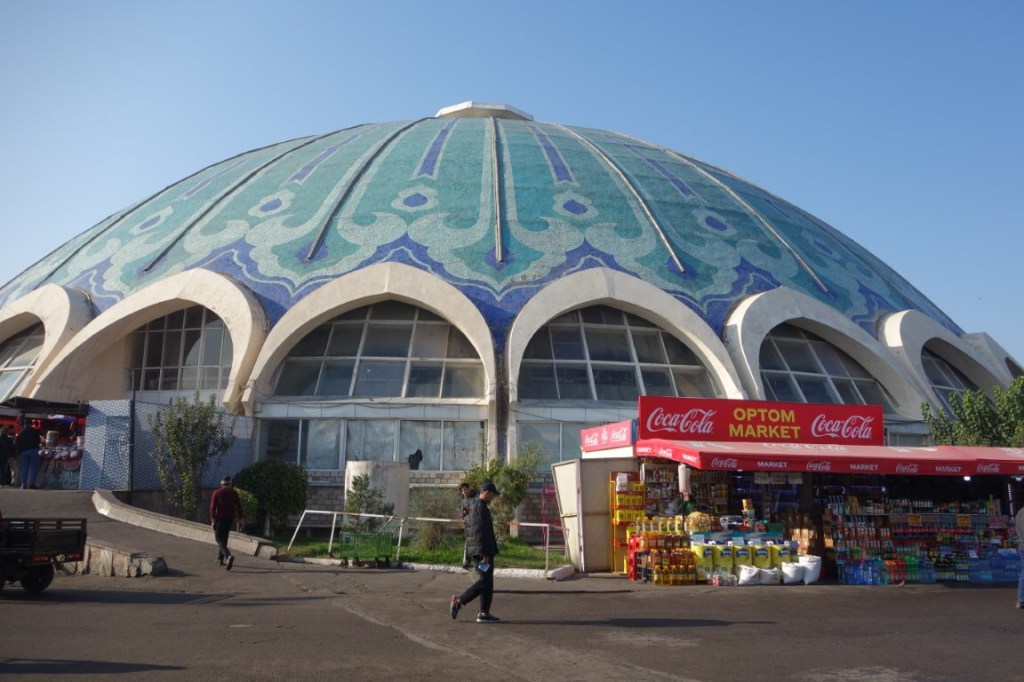 E o Mercado Chorsu anda perto deles. Já se sabe que os bazares são o coração das cidades orientais, onde se sente o seu pulsar vibrante. O Chorsu não foge à norma e aqui, depois de apreciarmos a sua inconfundível arquitectura oval onde se destaca a enorme cúpula também decorada com mosaicos azuis, entramos e logo usufruímos da sua grandeza e vida. Já centenário, no seu interior – mas também em larga medida nas imediações – tudo se vende, como carne, uma série de produtos derivados do leite, fruta de um colorido esfuziante, especiarias idem, frutos secos, doces e, entre muitos outros, massa diversa como aquela que servirá para fazer o laghman, um dos pratos nacionais. Como sempre, as pessoas são simpáticas e têm gosto em nos dar a provar os seus produtos.