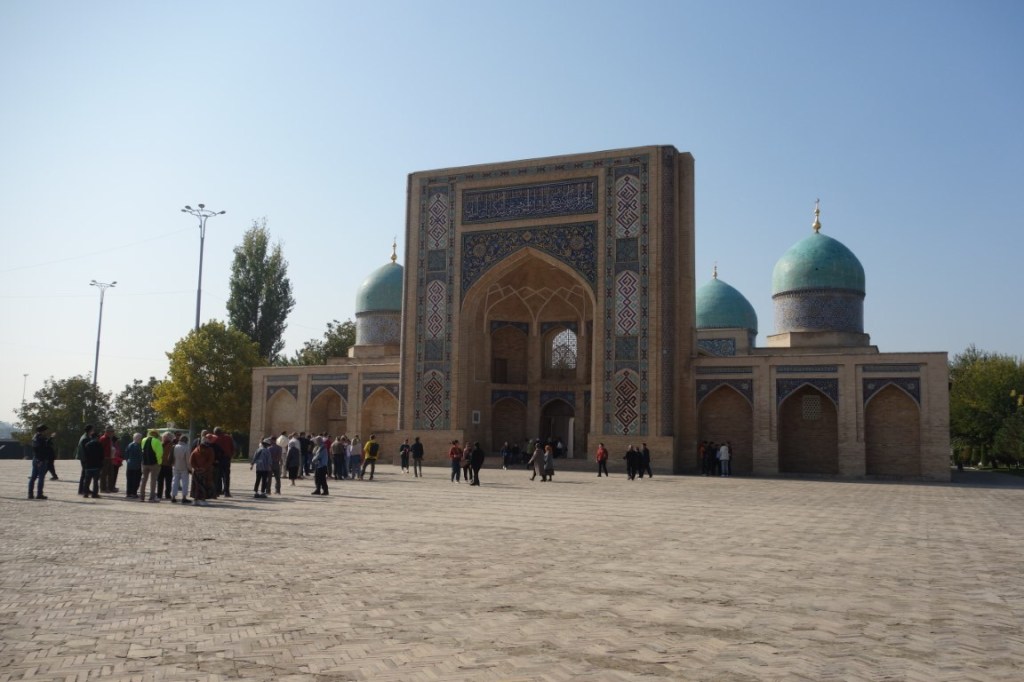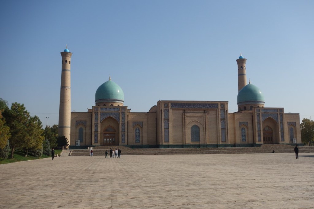 Atravessadas as ruas de um bairro feito de casas de barro, correspondente ao antigo casario da hoje metrópole que resistiu ao terramoto, chegamos ao Complexo Hazrat Imam, o centro espiritual da cidade. Hazrat Imam foi um dos primeiros imanes da cidade, erudito, cientista, poeta e artesão e aqui está o seu túmulo, juntamente com edifícios monumentais, como a Madraça Barak-Khan, a Mesquita Hast Iman, a Mesquita Tilla Sheikh e o Instituto Islâmico Imam al-Bukhari. Todos estes edifícios possuem uma arquitectura a que não estamos habituados, mas que, uma vez visitado o Usbequistão, percebemos que é típica deste país. Não cansa admirar uma e outra vez os seus mosaicos. A Madraça Barak-Khan, imponente no seu portal de entrada, tem o pátio ocupado por uma série de lojas que vendem ao turista lembranças da sua visita. A Mesquita Hast Iman é recente, bem como os dois minaretes que a acompanham, tendo sido construídos em 2007, ao estilo do século 16. E o complexo é ainda famoso por possuir um museu, instalado na antiga Madraça Moyi Mobarak, onde para além de uma rica biblioteca com manuscritos orientais está guardado aquele que é considerado o mais antigo Corão do mundo, escrito em meados do século 7. É um Corão otomano que se crê ter estado nas cidades de Medina, Damasco e Bagdade, à guarda dos respectivos califas, e que nos tempos de Tamerlão terá sido trazido para o Usbequistão; no século 19 andou por São Petersburgo, onde os cientistas russos comprovaram a sua autenticidade e o remeteram novamente para o país.