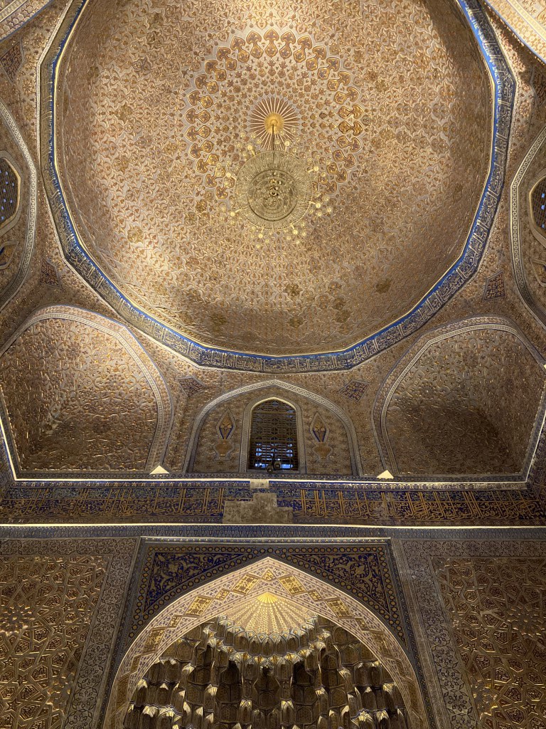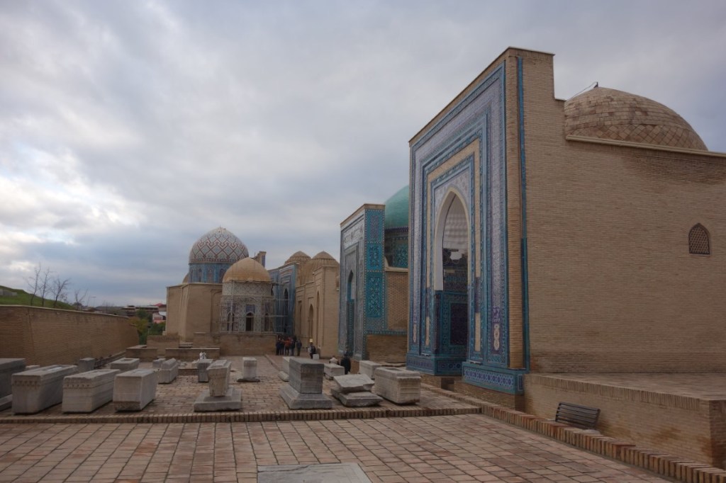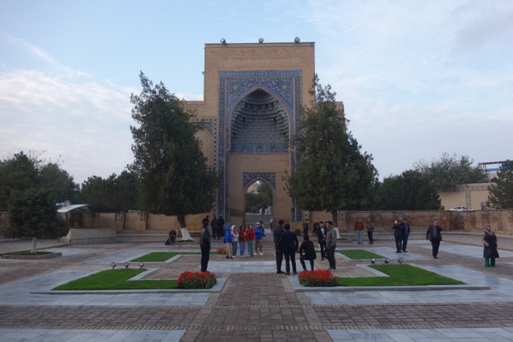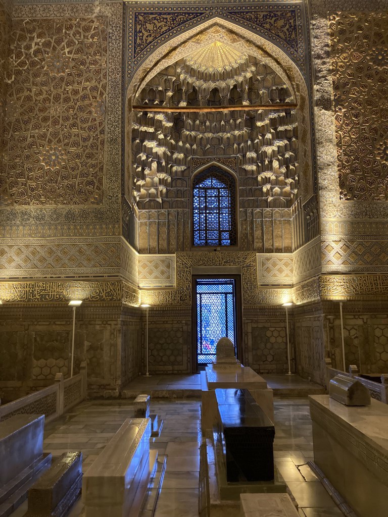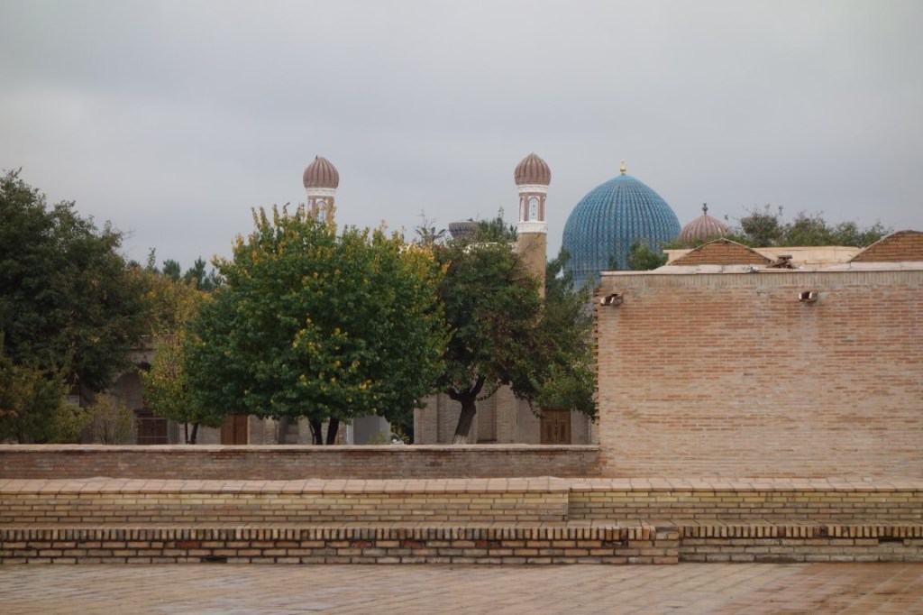 Construído no início do século 15, o complexo do Mausoléu Gur-e-Amir é uma beleza. Um majestoso portal antecipa um pátio para lá do qual está o edifício que acolhe para a eternidade os túmulos de Timur e alguns dos seus descendentes. Este edifício foi mandado construir originalmente por Muhammad Sultan para servir de madraça, centro da educação e conhecimento islâmico, mas este neto de Timur acabou por falecer e o avô mudou os planos e ordenou que servisse antes de seu mausoléu. Todavia, ele próprio faleceu entretanto e foi outro dos seus netos, Ulugh Beg (decore-se este nome, igualmente central na história do Usbequistão e até da humanidade), que tomou a iniciativa de transformar este no mausoléu de Timur. Hoje permanecem lá todos os personagens atrás mencionados e ainda dois dos filhos de Timur. O túmulo deste destaca-se dos outros, estando num plano mais elevado e sendo de cor diferente, feito de uma só peça de jade.