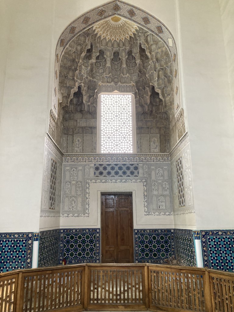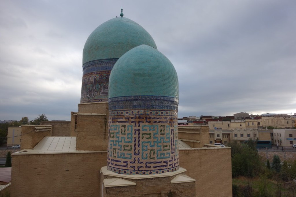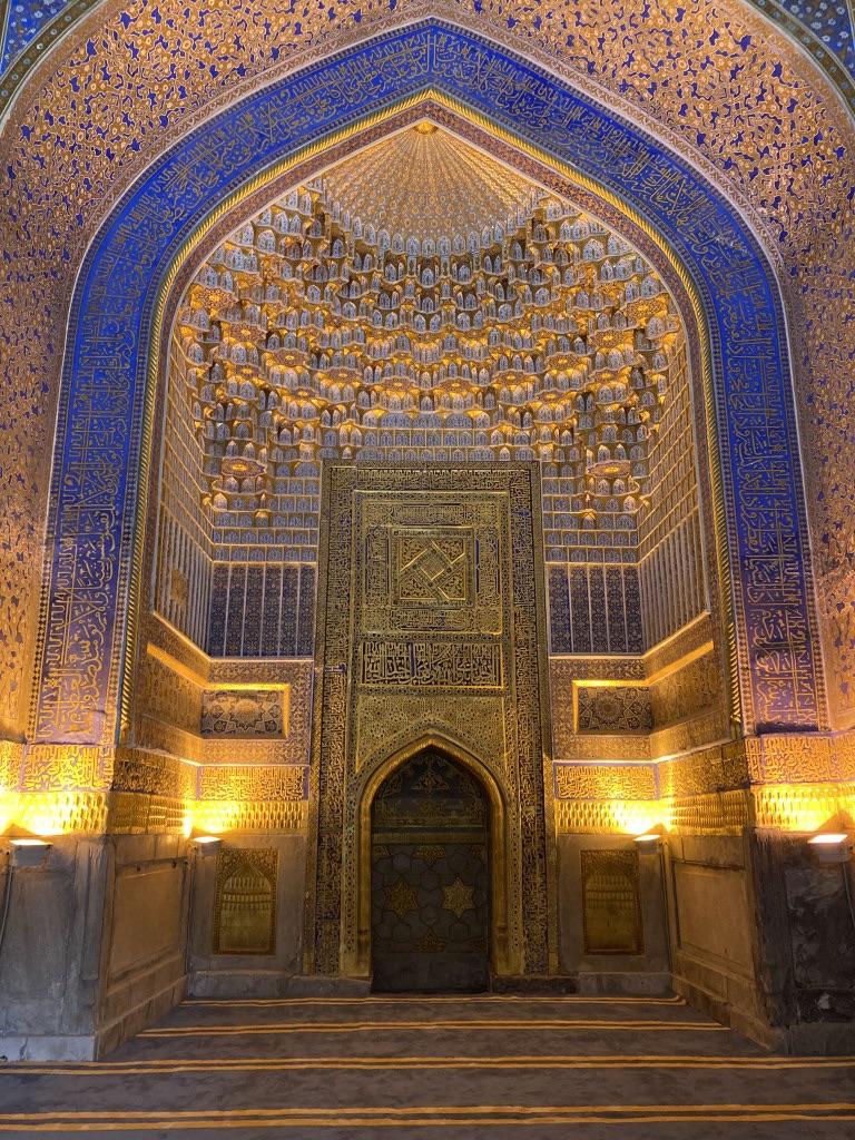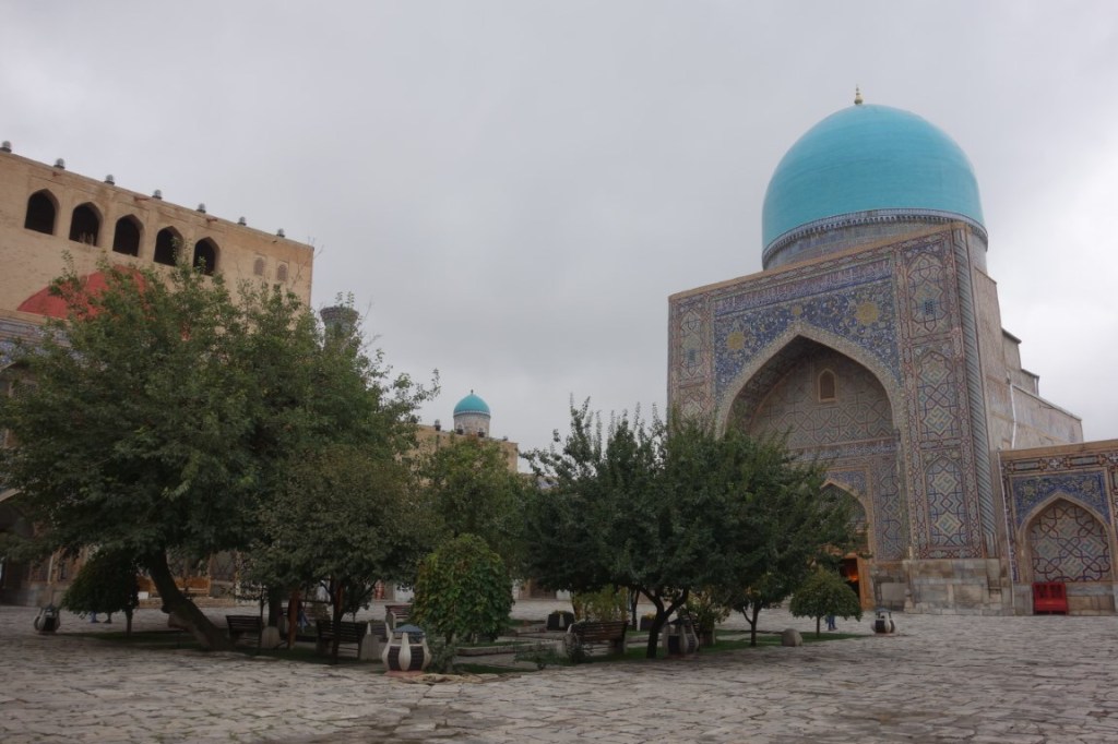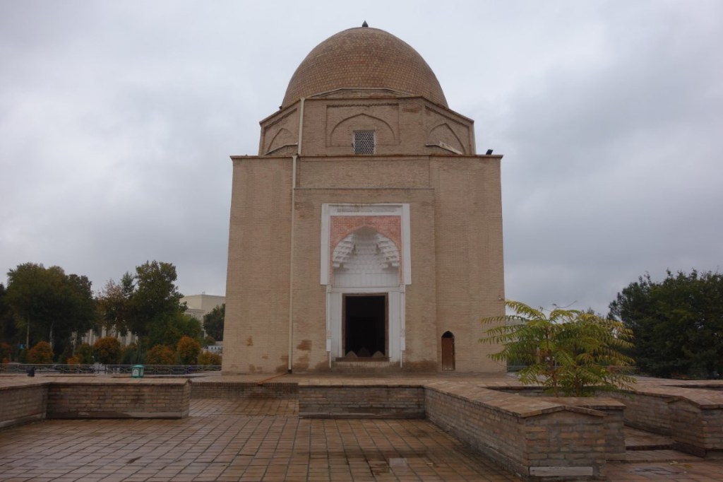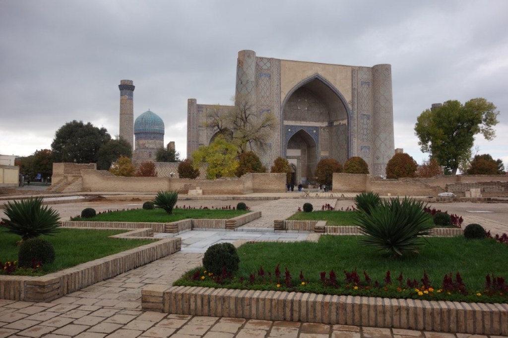 Construído no início do século 15, o complexo do Mausoléu Gur-e-Amir é uma beleza. Um majestoso portal antecipa um pátio para lá do qual está o edifício que acolhe para a eternidade os túmulos de Timur e alguns dos seus descendentes. Este edifício foi mandado construir originalmente por Muhammad Sultan para servir de madraça, centro da educação e conhecimento islâmico, mas este neto de Timur acabou por falecer e o avô mudou os planos e ordenou que servisse antes de seu mausoléu. Todavia, ele próprio faleceu entretanto e foi outro dos seus netos, Ulugh Beg (decore-se este nome, igualmente central na história do Usbequistão e até da humanidade), que tomou a iniciativa de transformar este no mausoléu de Timur. Hoje permanecem lá todos os personagens atrás mencionados e ainda dois dos filhos de Timur. O túmulo deste destaca-se dos outros, estando num plano mais elevado e sendo de cor diferente, feito de uma só peça de jade.