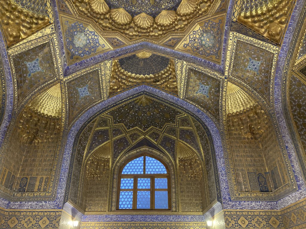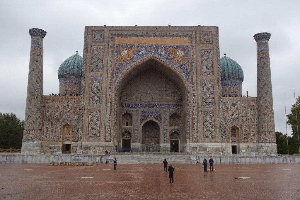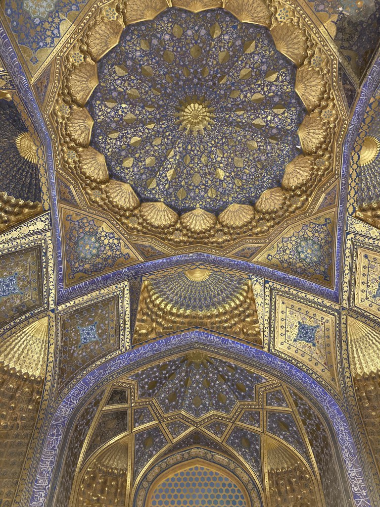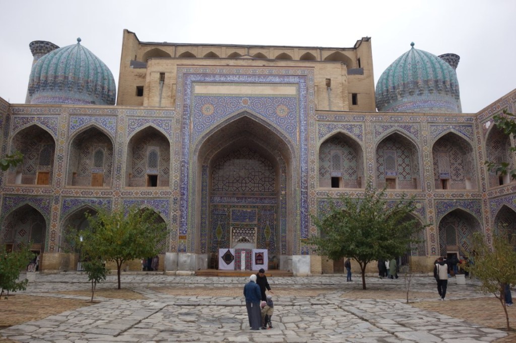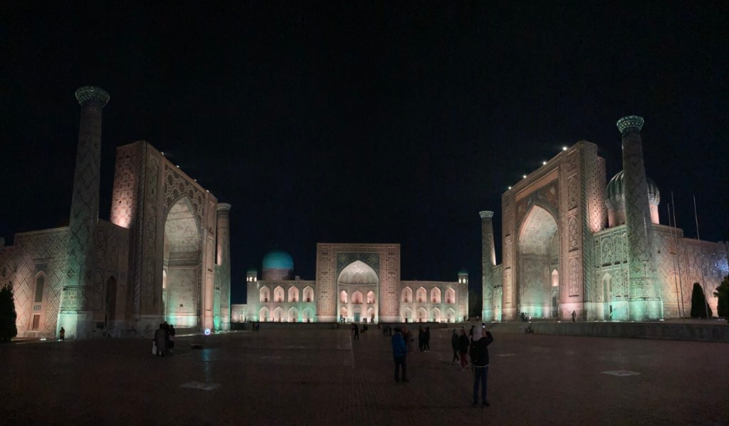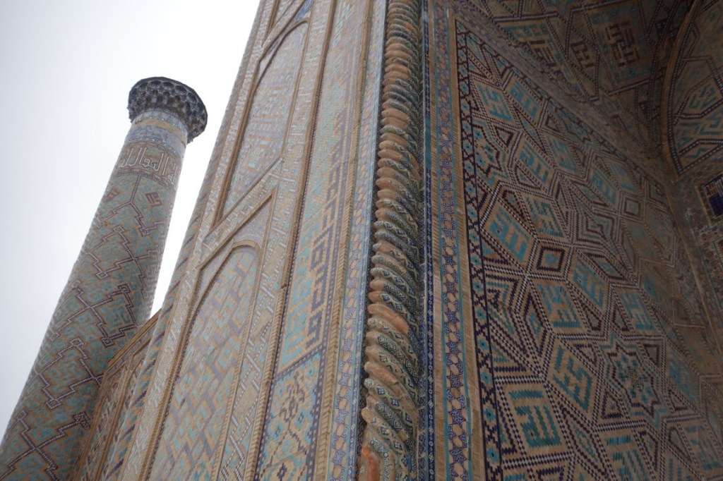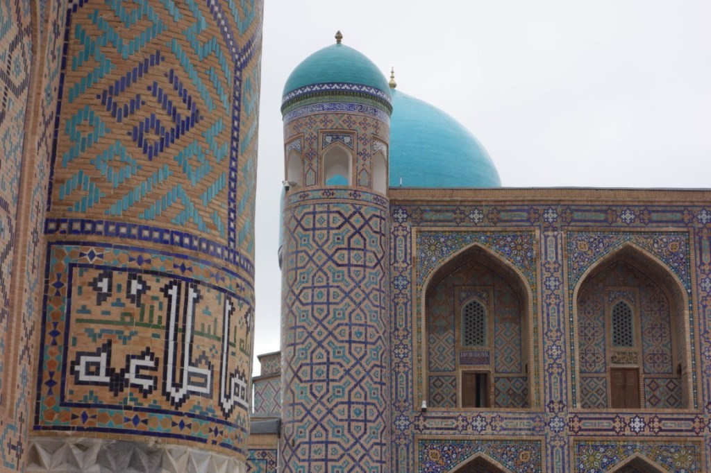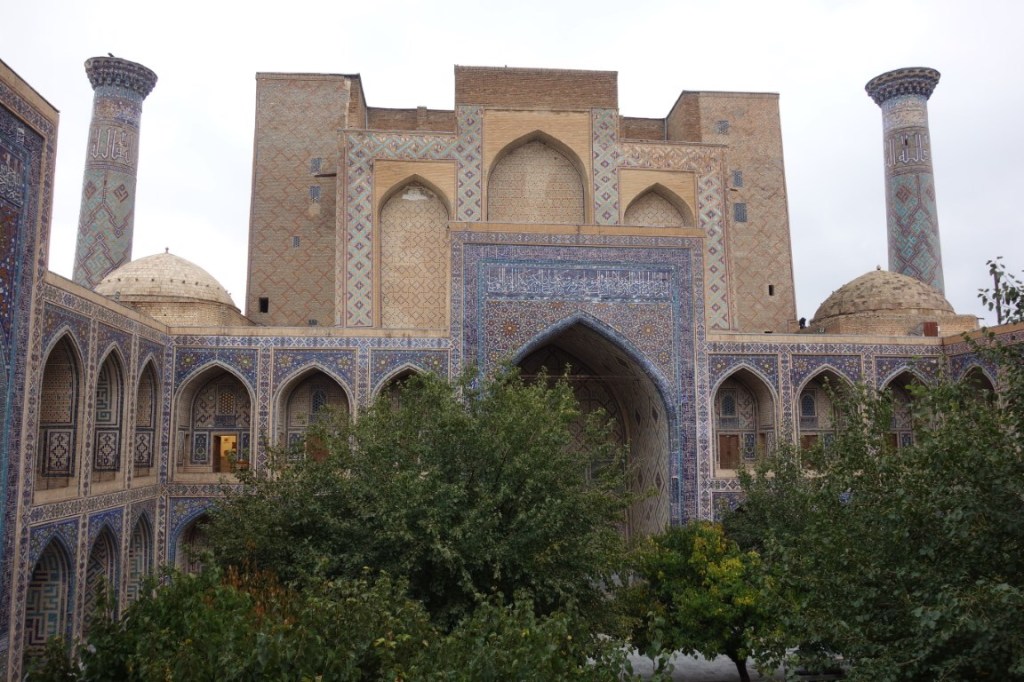 O Registão é a grande obra do império e o ponto alto da visita a Samarcanda e Usbequistão e um modelo da arquitectura oriental e islâmica. É um complexo composto por três madraças construídas entre os séculos 15 e 17, com uma ampla praça de permeio. A palavra “registão” vem do persa, de significado “lugar de areia” por ser areia que nos tempos antigos cobria esta praça, centro da vida social da cidade antes mesmo da existência das madraças, lugar onde se juntava a população para os momentos públicos, fossem anúncios de estado, celebrações ou execuções e onde os comerciantes vinham para vender os seus produtos. Tempos depois foram, então, construídas as madraças, e os portais de cada uma delas, virados para a praça, são monumentais. Não parecem, mas são de diferentes épocas: à esquerda, a Ulugh Beg, mais antiga, do século 15, e as outras duas, a Sher-Dor e a Tilya-Kori, do século 17, quando Samarcanda se preparava para entrar em declínio e ser substituída por Bucara em projecção – nos séculos que se seguiram, a sua população era escassa e as madraças serviram de abrigo para animais. Algo que surpreendeu nesta viagem pelo Usbequistão foi constatar como tantos dos seus inúmeros monumentos estão recuperados e restaurados, porque sabemos através de fotos que passaram por maus momentos ao longo da sua história. As madraças são escolas dedicadas ao estudo do islão. No início do século 20, o governo soviético proibiu a actividade religiosa das escolas, o que levou à sua mais rápida decadência; no entanto, foram também os soviéticos que iniciaram o restauro do Registão e outros momentos ancestrais e deram força ao simbolismo da sua importância enquanto legado da Rota da Seda.