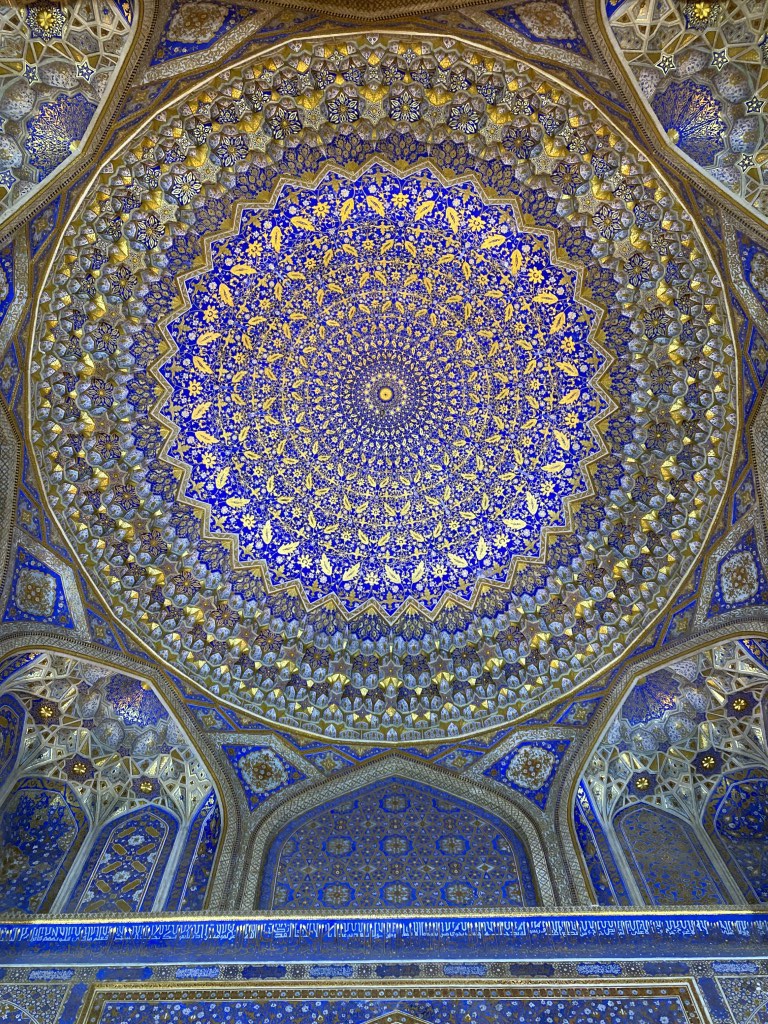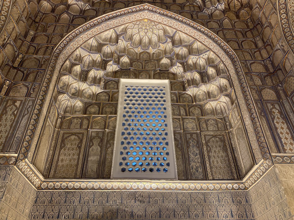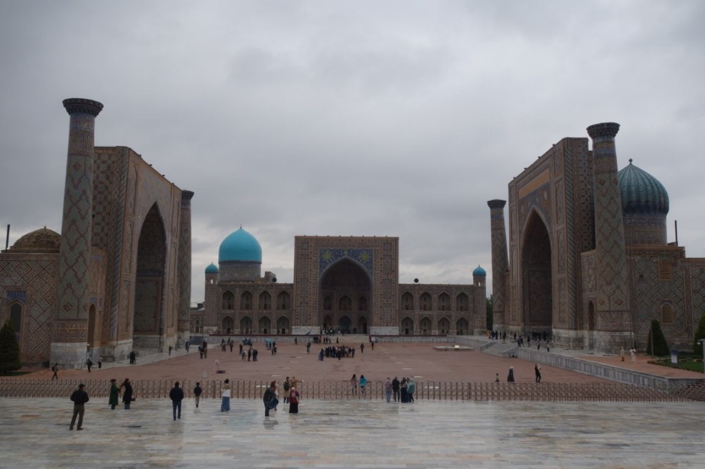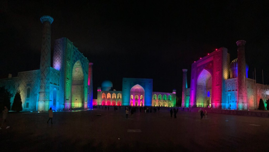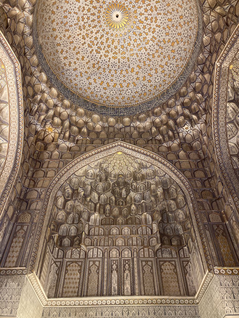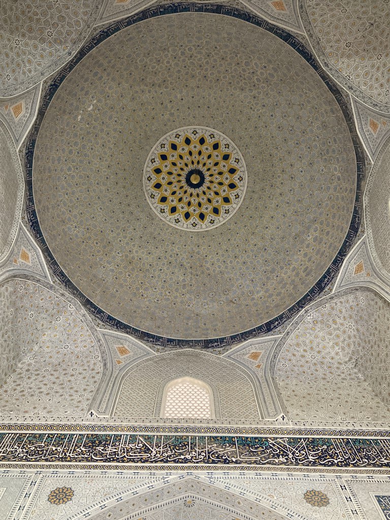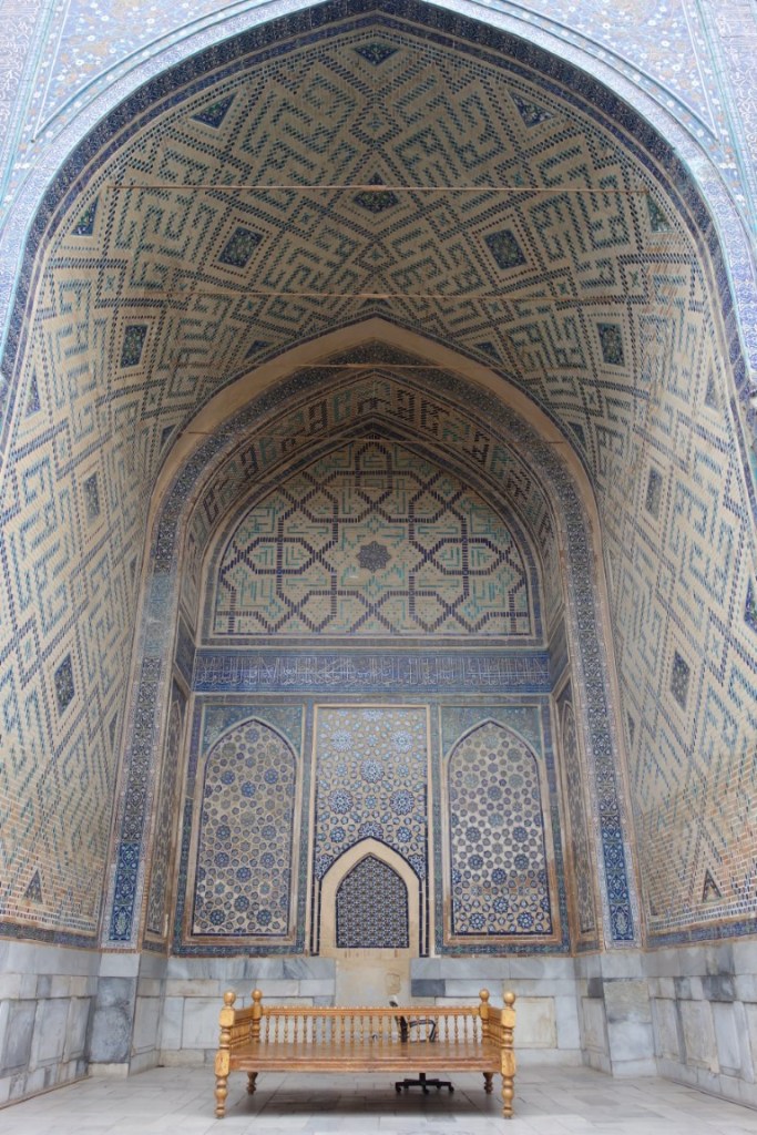 O Registão é a grande obra do império e o ponto alto da visita a Samarcanda e Usbequistão e um modelo da arquitectura oriental e islâmica. É um complexo composto por três madraças construídas entre os séculos 15 e 17, com uma ampla praça de permeio. A palavra “registão” vem do persa, de significado “lugar de areia” por ser areia que nos tempos antigos cobria esta praça, centro da vida social da cidade antes mesmo da existência das madraças, lugar onde se juntava a população para os momentos públicos, fossem anúncios de estado, celebrações ou execuções e onde os comerciantes vinham para vender os seus produtos. Tempos depois foram, então, construídas as madraças, e os portais de cada uma delas, virados para a praça, são monumentais. Não parecem, mas são de diferentes épocas: à esquerda, a Ulugh Beg, mais antiga, do século 15, e as outras duas, a Sher-Dor e a Tilya-Kori, do século 17, quando Samarcanda se preparava para entrar em declínio e ser substituída por Bucara em projecção – nos séculos que se seguiram, a sua população era escassa e as madraças serviram de abrigo para animais. Algo que surpreendeu nesta viagem pelo Usbequistão foi constatar como tantos dos seus inúmeros monumentos estão recuperados e restaurados, porque sabemos através de fotos que passaram por maus momentos ao longo da sua história. As madraças são escolas dedicadas ao estudo do islão. No início do século 20, o governo soviético proibiu a actividade religiosa das escolas, o que levou à sua mais rápida decadência; no entanto, foram também os soviéticos que iniciaram o restauro do Registão e outros momentos ancestrais e deram força ao simbolismo da sua importância enquanto legado da Rota da Seda.