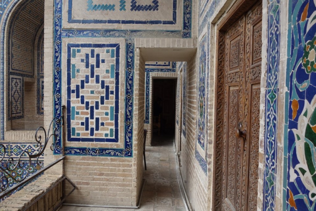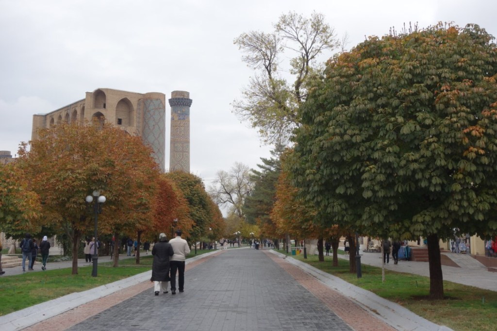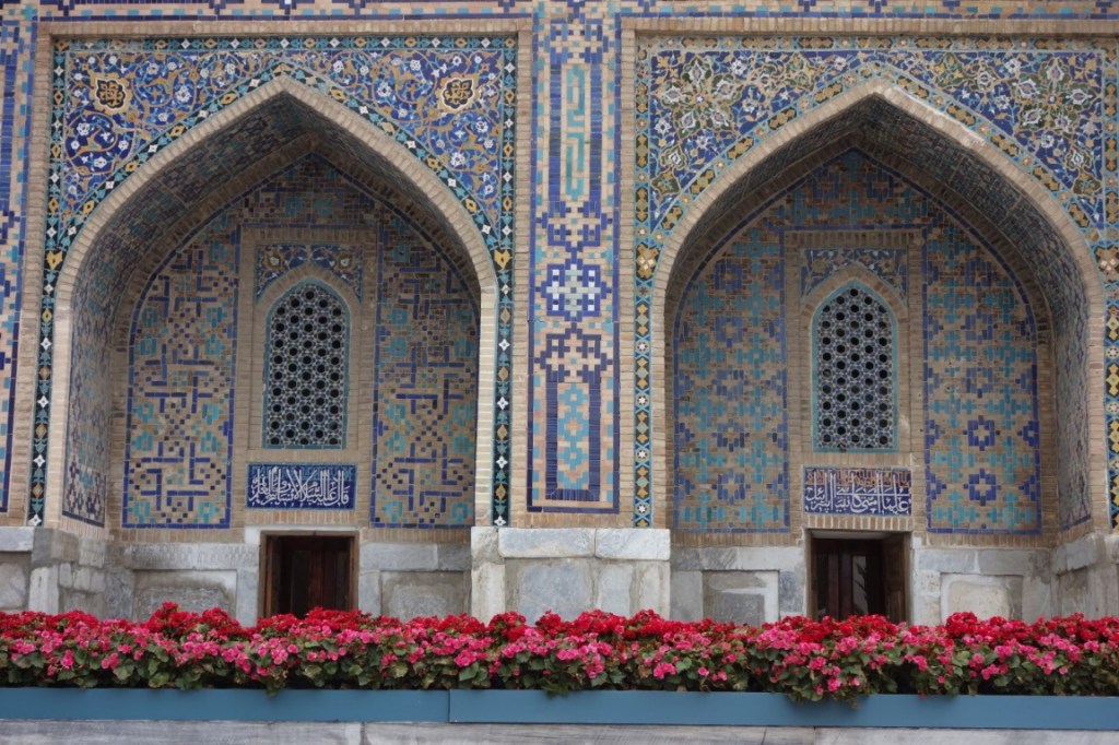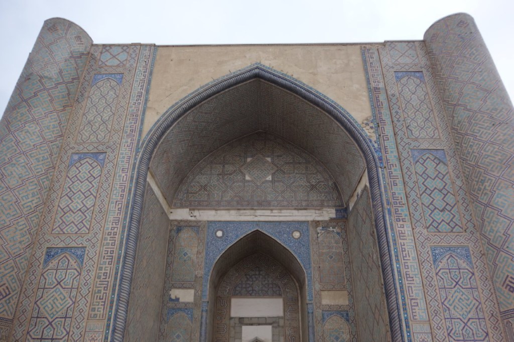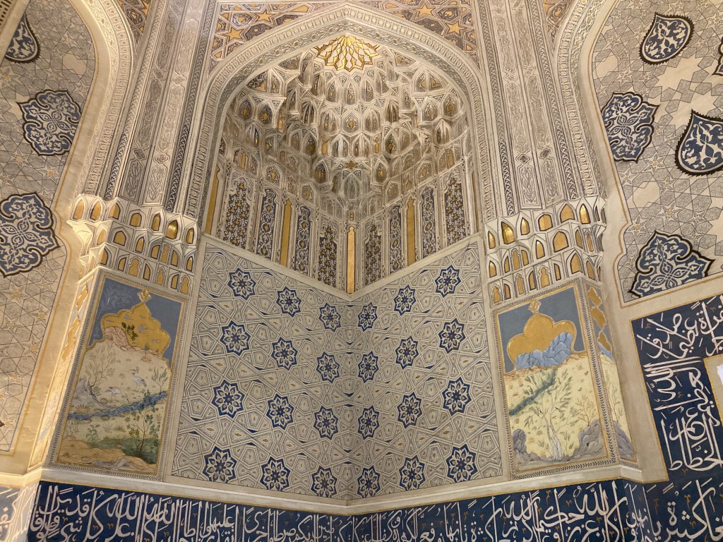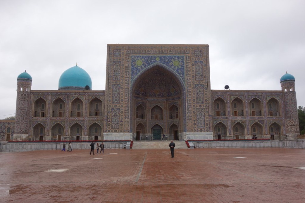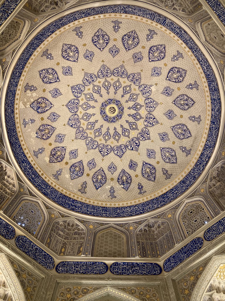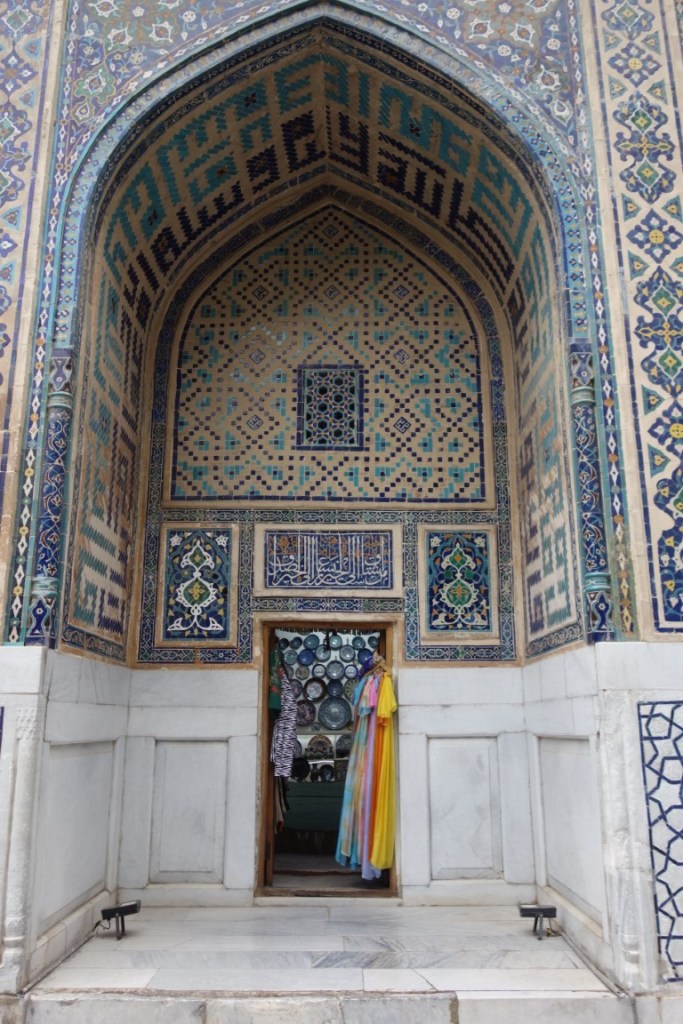 O Registão é a grande obra do império e o ponto alto da visita a Samarcanda e Usbequistão e um modelo da arquitectura oriental e islâmica. É um complexo composto por três madraças construídas entre os séculos 15 e 17, com uma ampla praça de permeio. A palavra “registão” vem do persa, de significado “lugar de areia” por ser areia que nos tempos antigos cobria esta praça, centro da vida social da cidade antes mesmo da existência das madraças, lugar onde se juntava a população para os momentos públicos, fossem anúncios de estado, celebrações ou execuções e onde os comerciantes vinham para vender os seus produtos. Tempos depois foram, então, construídas as madraças, e os portais de cada uma delas, virados para a praça, são monumentais. Não parecem, mas são de diferentes épocas: à esquerda, a Ulugh Beg, mais antiga, do século 15, e as outras duas, a Sher-Dor e a Tilya-Kori, do século 17, quando Samarcanda se preparava para entrar em declínio e ser substituída por Bucara em projecção – nos séculos que se seguiram, a sua população era escassa e as madraças serviram de abrigo para animais. Algo que surpreendeu nesta viagem pelo Usbequistão foi constatar como tantos dos seus inúmeros monumentos estão recuperados e restaurados, porque sabemos através de fotos que passaram por maus momentos ao longo da sua história. As madraças são escolas dedicadas ao estudo do islão. No início do século 20, o governo soviético proibiu a actividade religiosa das escolas, o que levou à sua mais rápida decadência; no entanto, foram também os soviéticos que iniciaram o restauro do Registão e outros momentos ancestrais e deram força ao simbolismo da sua importância enquanto legado da Rota da Seda.