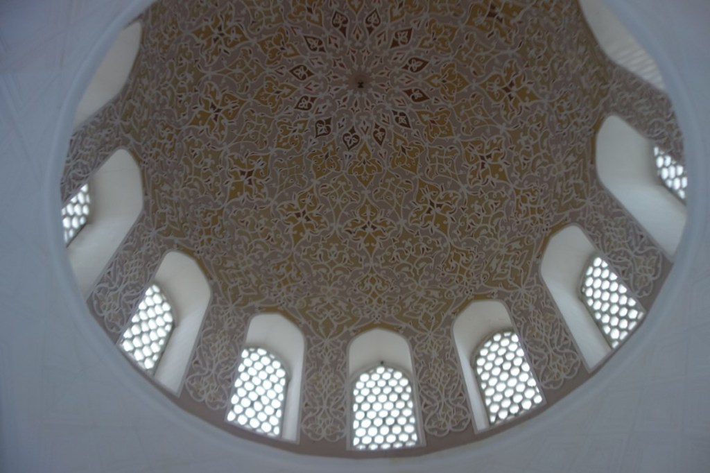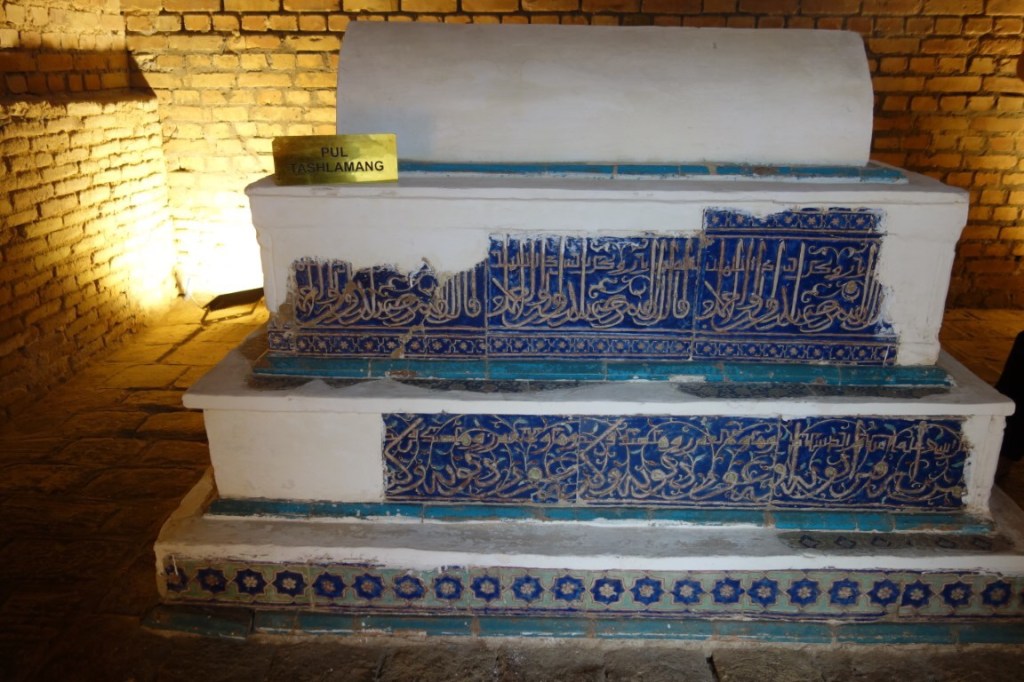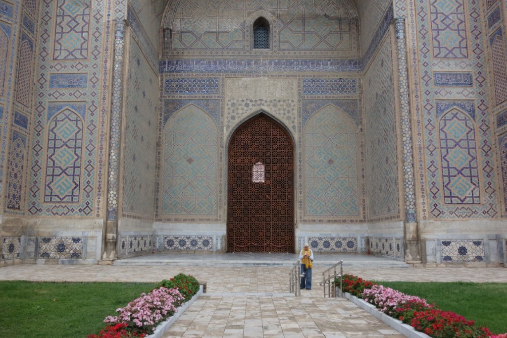 A nossa primeira visita foi ao Gur-e-Amir, o mausoléu de Timur (Tamerlão), o responsável pela grandeza de Samarcanda no século 14, tendo-a tornado capital do seu largo império. Timur era um homem violento, diz-se que nas suas conquistas gostava de deixar pelo caminho as cabeças decepadas dos seus inimigos – o seu mausoléu possui a inscrição “se eu fosse vivo, as pessoas não estariam contentes”, realçando a sua fama de tirano -, mas foi ao mesmo tempo patrono das artes e da arquitectura, lançando as bases de um estilo magnífico que, consideram muitos, antecipou o esplendor do Taj Mahal, construído pelos seus descendentes que fundaram eles próprios o império Mughal na Índia.