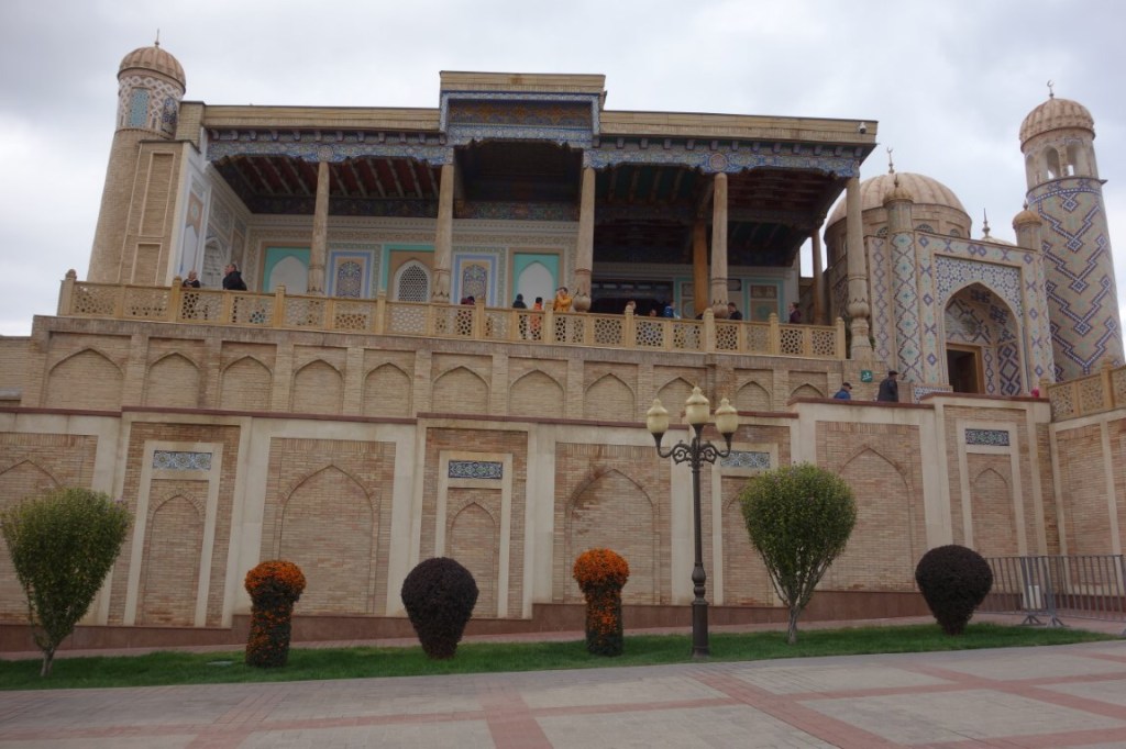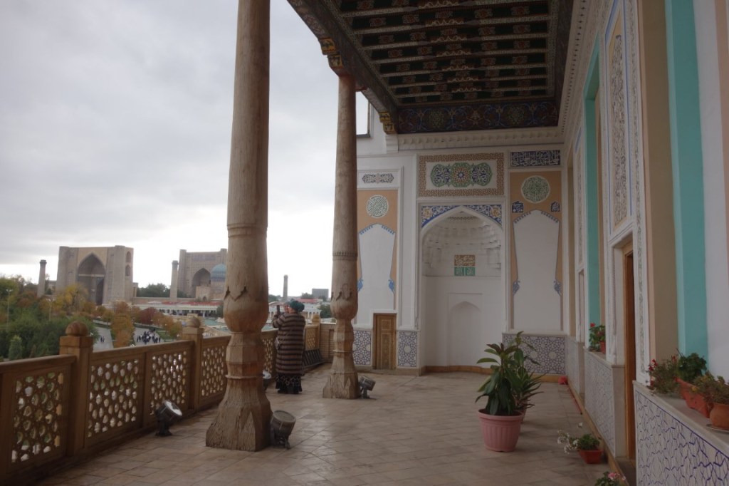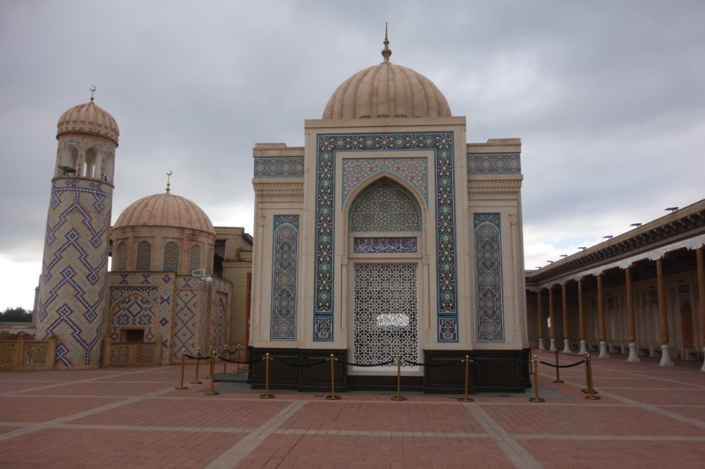 Era segunda-feira, dia de encerramento do bazar, e seguimos em direcção à colina que lhe é sobranceira, onde está a Mesquita Hazrat Hyzr. Construída no sítio de uma antiga mesquita totalmente arrasada pelas tropas de Gengis Khan, em 1220, a actual data de 1884. E dá ares de palacete. Da sua varanda alpendrada obtém-se grandes vistas da cidade, mas este é só por si um espaço bem bonito, suportado por colunas de madeira ornamentadas, típico da arquitectura das mesquitas do Usbequistão. Colunas semelhantes vemos igualmente no pátio, a suportarem uma galeria coberta cujo tecto possui umas decorações coloridas. Para além de um delicado minarete, o conjunto acolhe também o mausoléu de Islam Karimov, o primeiro presidente do Usbequistão.