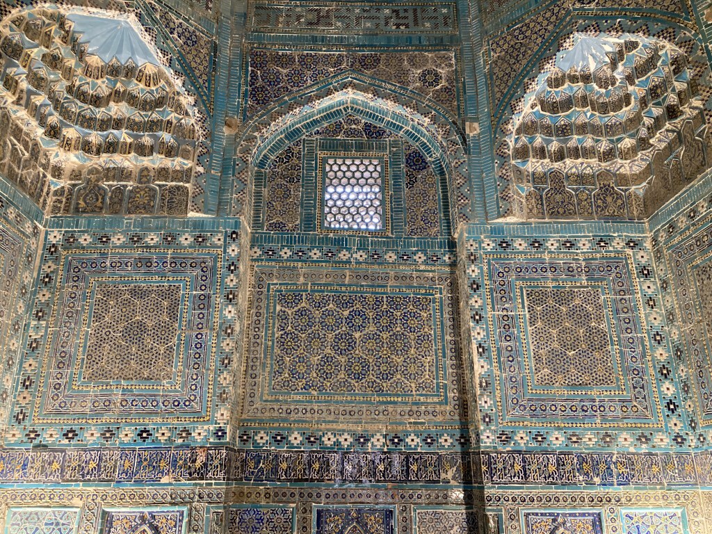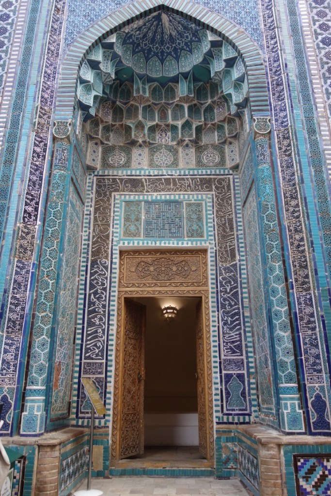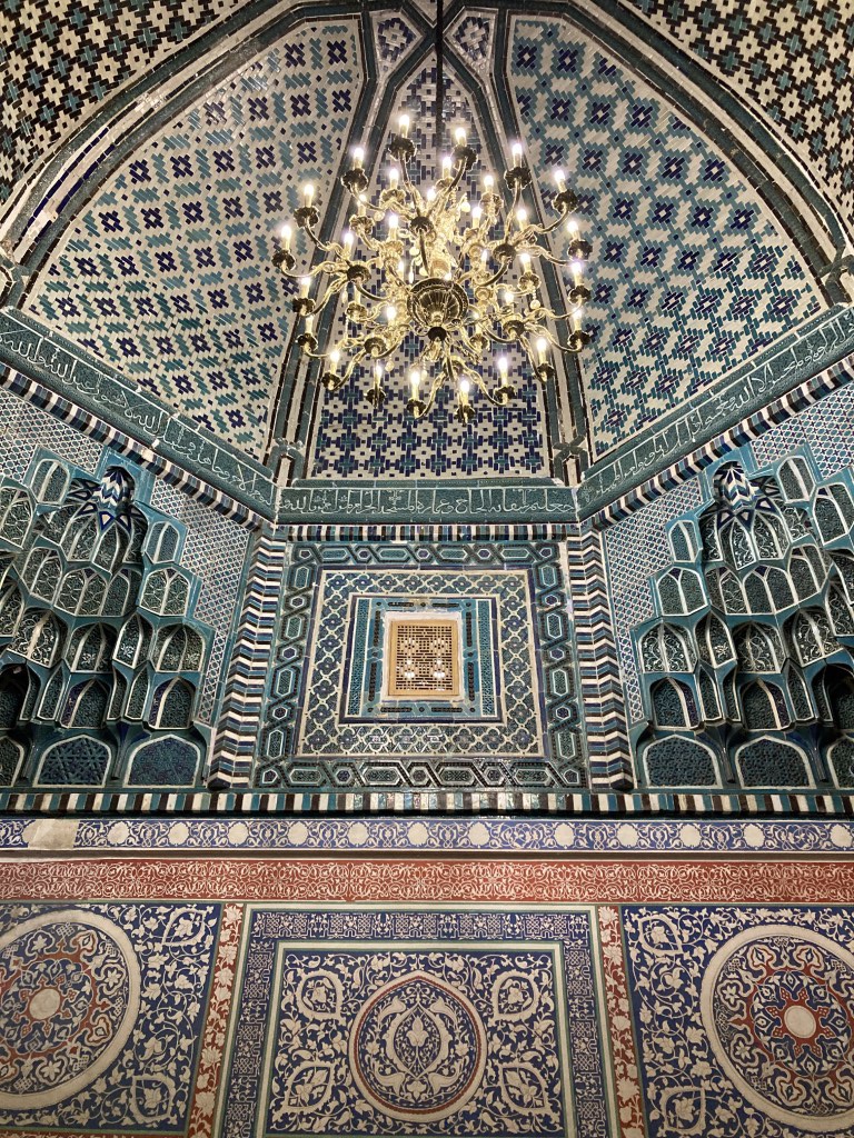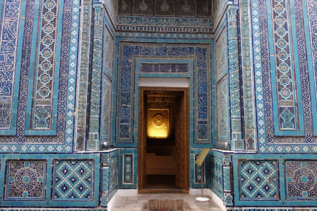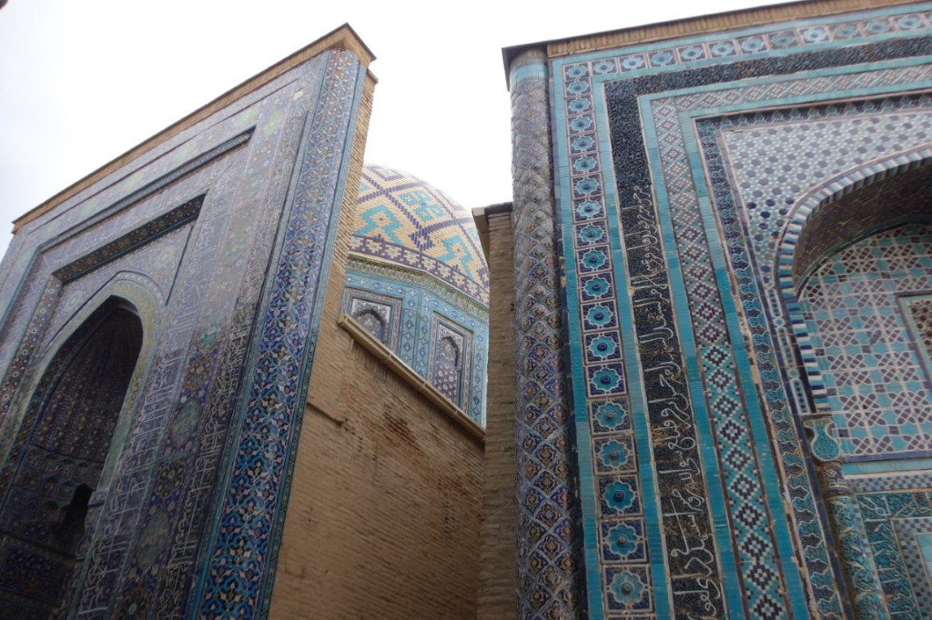E, por fim, chegamos a outro dos lugares imperdíveis de Samarcanda, o complexo Shah-i-Zinda. Em Afrasiyab, o lugar original da cidade que antecedeu Samarcanda antes da sua destruição pelos mongóis, esta necrópole é uma estreita avenida, a subir, pejada de mausoléus de ambos os lados, construídos entre 1370 e 1449. Um delírio decorativo cheio de cor e fantasia. O paraíso dos mosaicos em tons de azul. Aqui estão familiares de reis e nobres, e o persa Shah-i-Zinda significa literalmente “túmulo do rei vivo”. O facto de se crer que aqui está também o túmulo de Kusam ibn Abbas, primo do profeta Maomé, no final do complexo, tornou-o um lugar de peregrinação, por alguns equivalente à peregrinação (haji) a Meca.