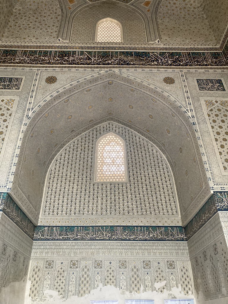 A Mesquita Bibi Khanum, à sua frente, é de uma escala impressionante e possui duas cúpulas maravilhosas, com (mais) uma improvável variedade de azuis e motivos decorativos, incluindo inscrições em árabe. Antes, porém, passamos por mais um majestoso portal, com 18 metros altura. Foi Timur quem ordenou a construção da mesquita em 1399, talvez em honra da sua mulher favorita, e para tal esta teria de ser a maior e mais bonita alguma vez vista no mundo, plena de materiais nobres, como mármore, e ricas decorações, para o que trouxe os melhores arquitectos e artesãos. No entanto, a ambição desmedida ainda não permitia tais construções na época e, poucos anos depois, a estrutura da mesquita começou a ruir, assim se mantendo até meados do século 20 (mantendo também o título de edifício mais alto da cidade). Só na década de 1970 é que os responsáveis soviéticos empreenderam o seu restauro, concluído já com o Usbequistão separado da União Soviética, como parte do ideal do seu primeiro e muito duradouro presidente Islam Karimov de recuperar os edifícios da época timúrida, fazendo de Timur o herói e orgulho da nova nação independente. Com um largo pátio, o interior da mesquita possui uma decoração semelhante à do mausoléu, mas aqui a cúpula tem mais uma roseta dourada.