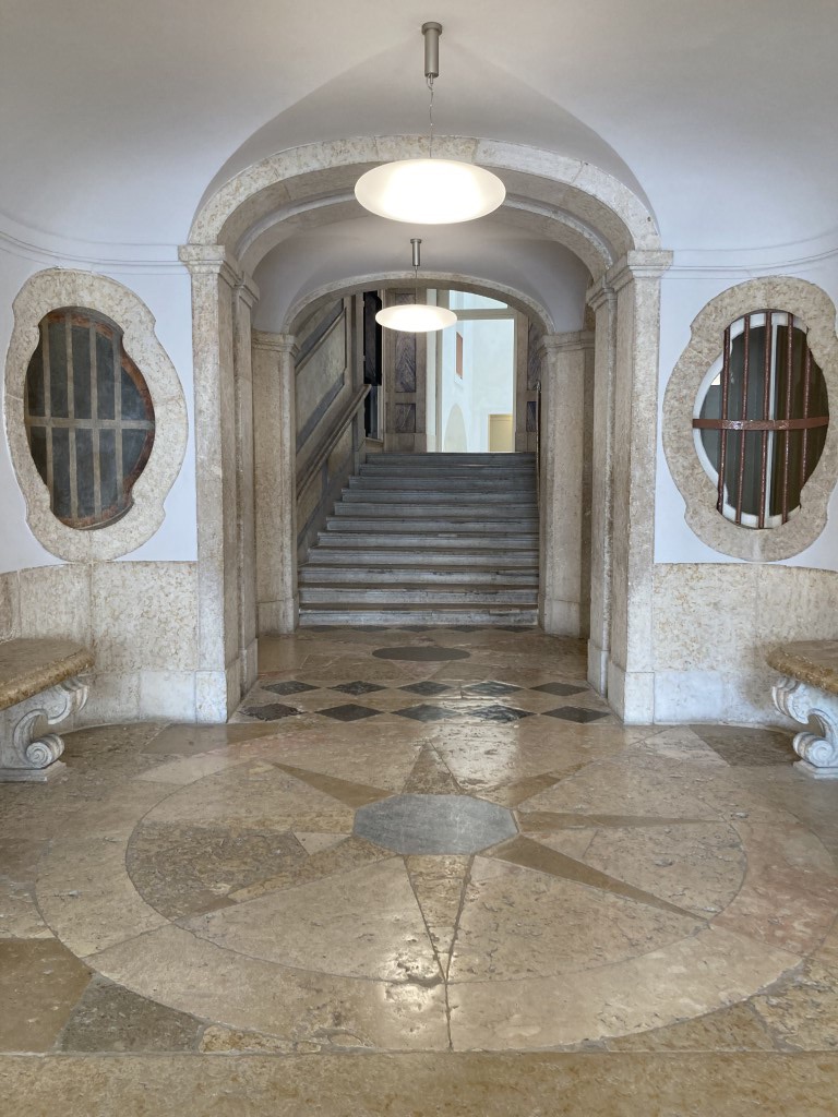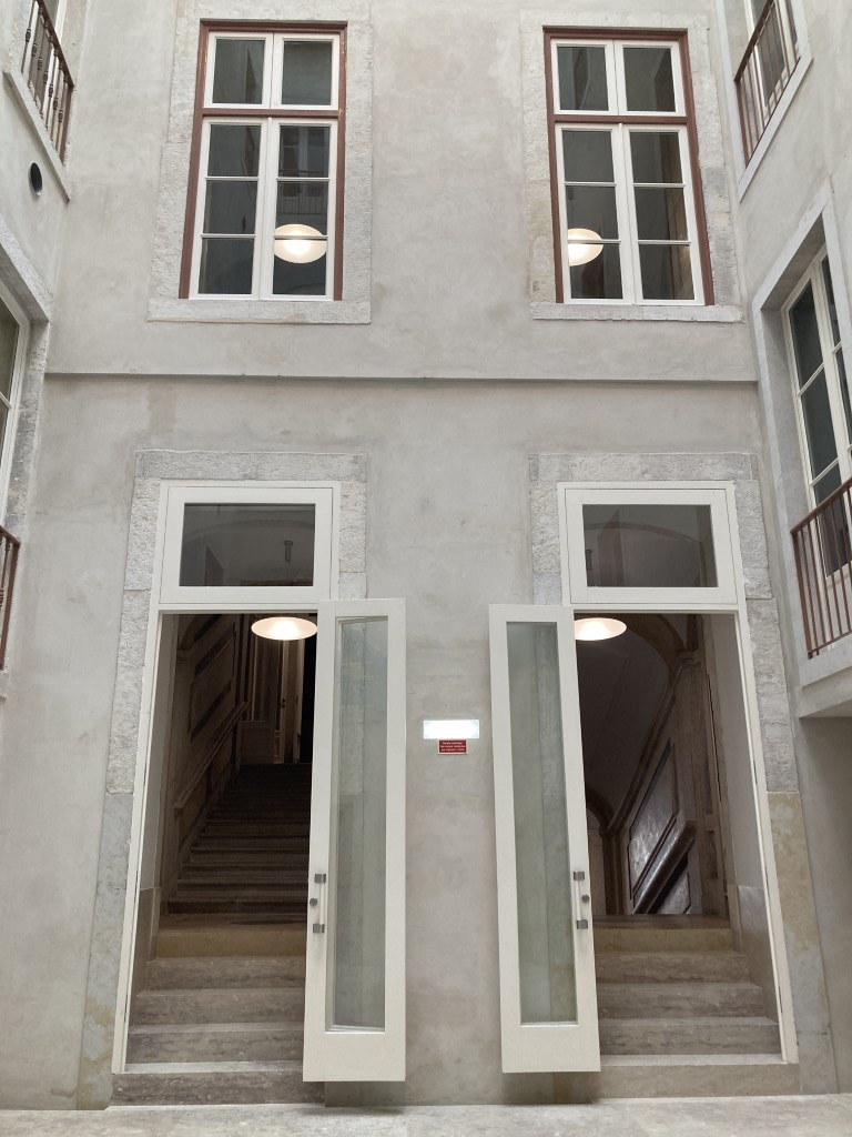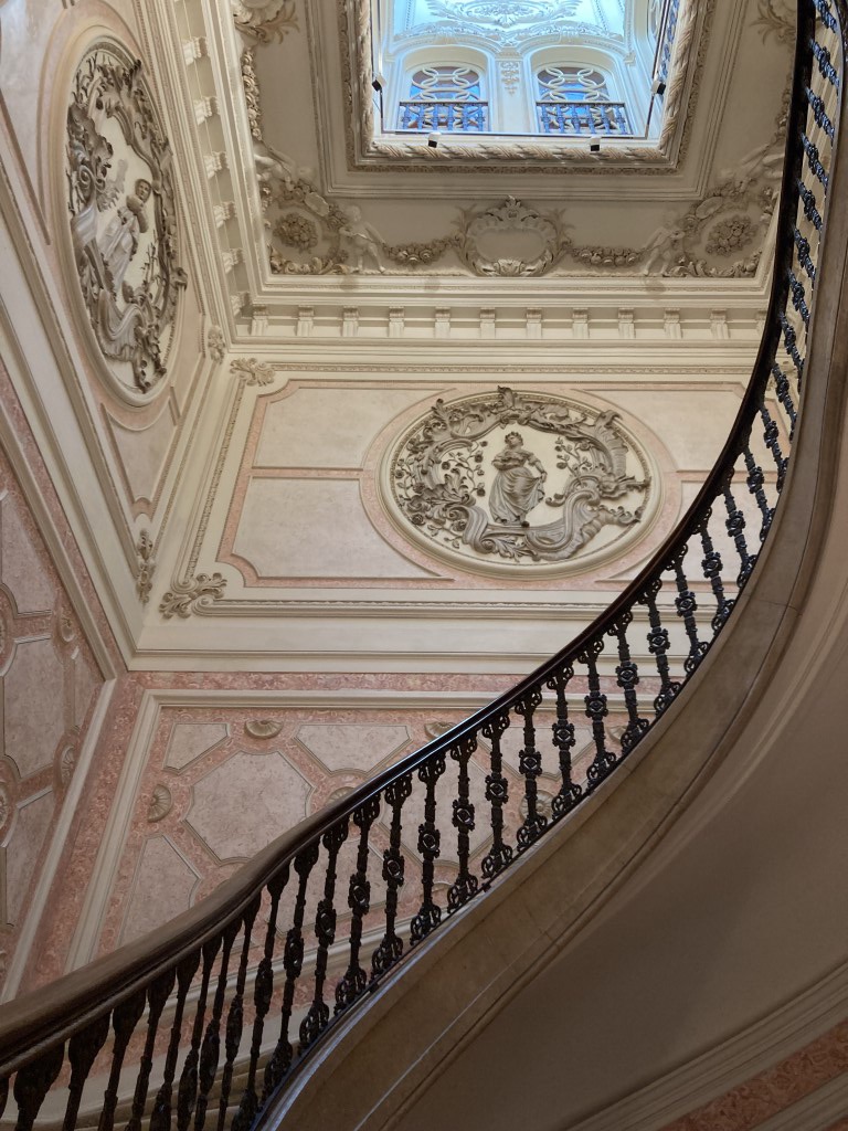 Esta escadaria é o elemento de maior carácter cenográfico, em curva e com medalhões decorativos com representação das 4 estações do ano, para além de decorações em estuque nas paredes e um lanternim no topo que a ilumina de forma natural.