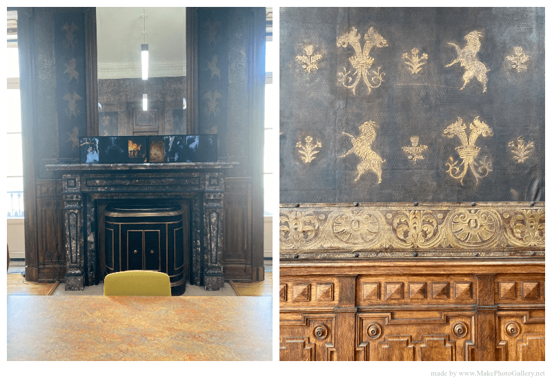 Na antiga sala de jantar do palácio, o Sala dos Couros, as paredes, revestidas a couro, estão decoradas com imagens de cabras e o brasão dos Costa Cabral, família que, por via de casamento, se tornou proprietária da casa.