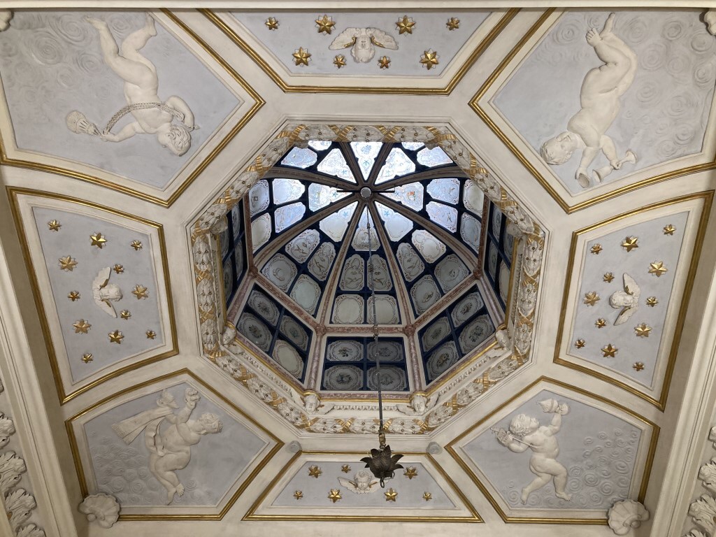 Já no andar nobre, os frescos dos tectos das salas produzem novo encanto, um elemento romântico com a representação de cenas variadas.