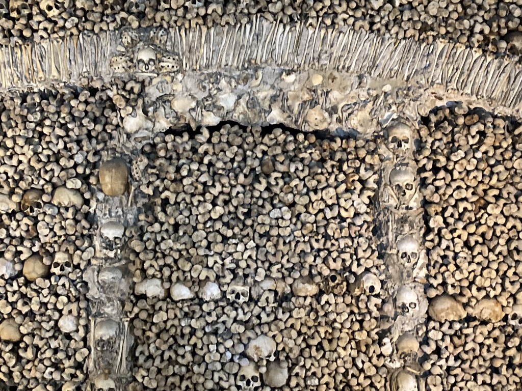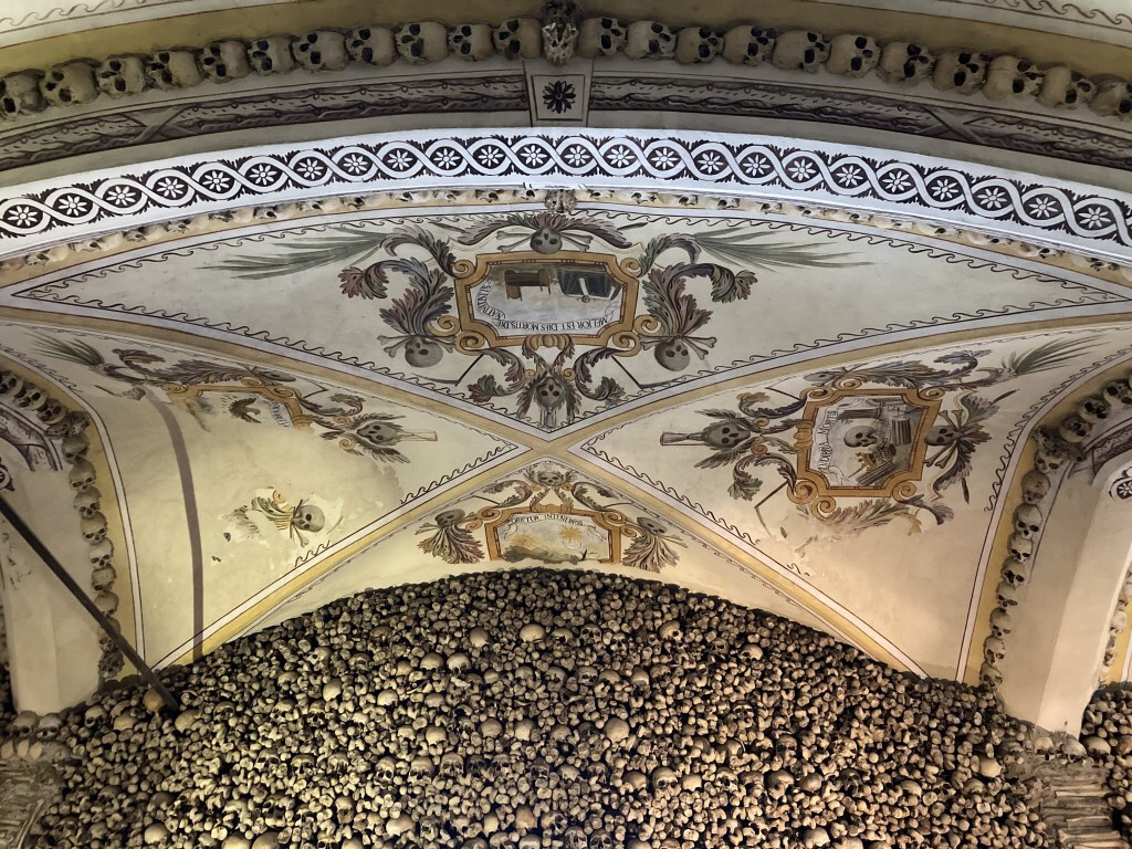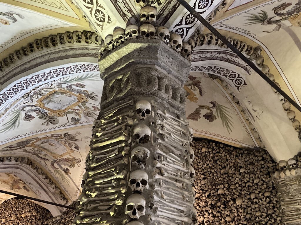 A Capela dos Ossos é hoje, no entanto, a grande atracção do conjunto, construída na primeira metade do séc 17 e a mais antiga de Portugal dedicada ao culto das Almas do Purgatório e, depois, ao Senhor dos Passos. Algo macabra, para alguns, coisa certa na vida, para outros. A ideia é a de provocar pela imagem a reflexão sobre a transitoriedade da vida humana e o consequente compromisso de uma permanente vivência cristã. À entrada somos recebidos por um anúncio: “Nós ossos que aqui estamos pelos vossos esperamos”. Pois é, as paredes e os pilares da Capela estão revestidos de alto a baixo por milhares de ossos e caveiras humanas provenientes dos espaços de enterramento do convento. Observam-se ainda azulejos nos rodapés e frescos na decoração do tecto com passagens bíblicas e outros instrumentos da Paixão de Cristo. À entrada da Capela, destaque para um elemento contemporâneo, um painel azulejar da autoria de Siza Vieira, representando uma alegoria que contrapõe a alusão da morte ao milagre da vida. A visitar, ainda, o núcleo museológico correspondente ao antigo dormitório dos frades, com obras de pintura, escultura, ourivesaria, paramentaria e objectos devocionais, bem como, na altura da nossa visita a exposição particular de presépios da Colecção Canha da Silva. Do terraço que dá para o mercado vê-se a entrada do centro histórico de Évora.