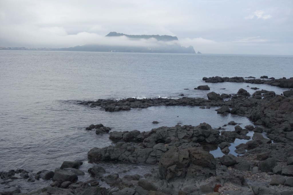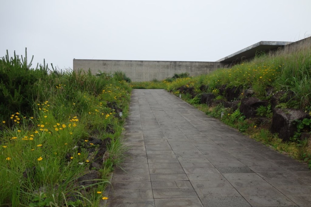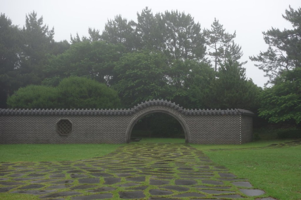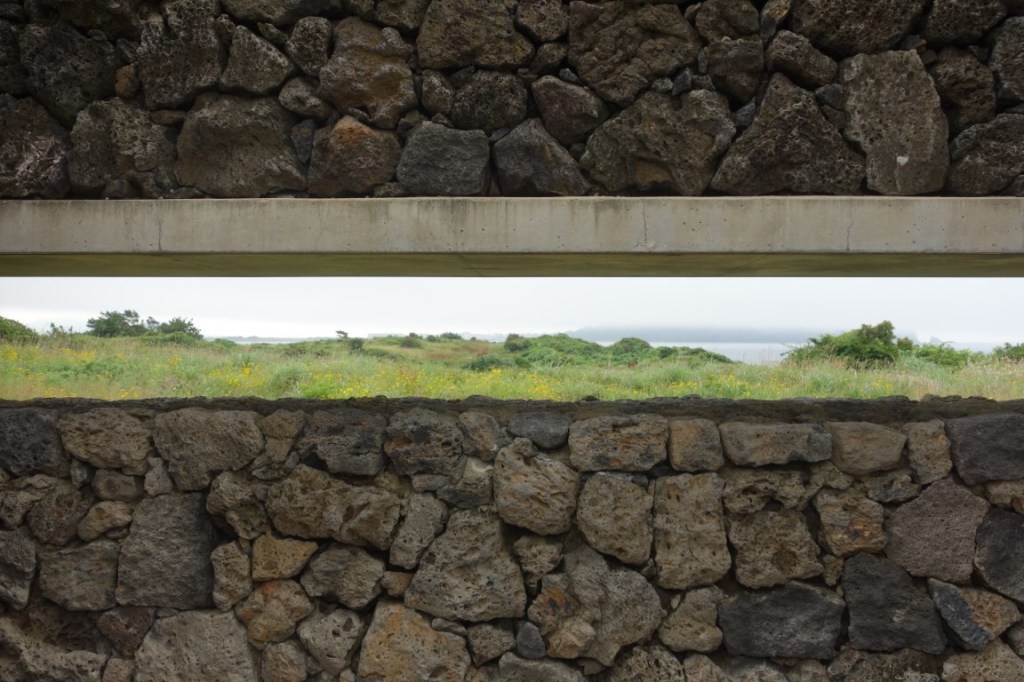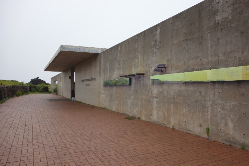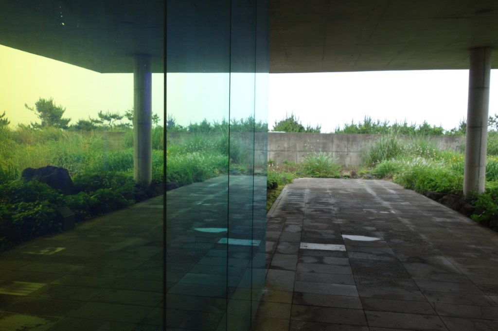 É provável de que da península onde estão instaladas a Glass House e o Museu Yumin, parte da mesma larga baía do Seongsan Ilchulbong, se alcancem grandiosas panorâmicas para o vulcão mítico de Jeju. Porém, o céu e, em consequência, o horizonte estavam baços e sem cor, feios, num palavra. Tínhamos escolhido terminar a nossa viagem pela Coreia do Sul na ilha de Jeju, para mergulhar entre paisagens exuberantes. Em quatro dias, nunca o sol apareceu, a chuva tornou-se um convidado inconveniente, afastando o desejo de experimentar as águas do mar de Jeju. Pior, o nevoeiro chegou a ser tão intenso que em muitos lugares nada pudemos perceber.