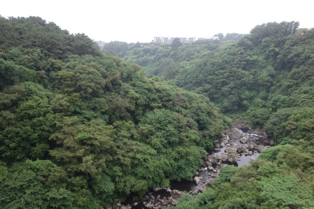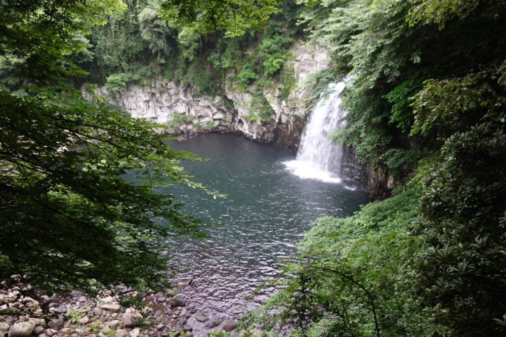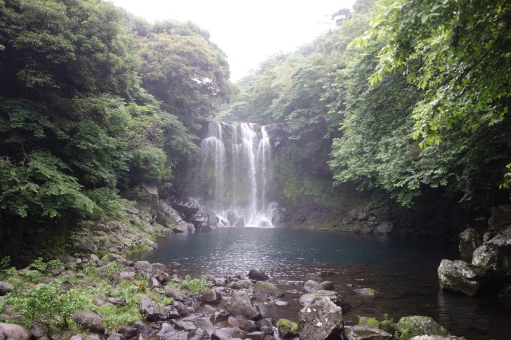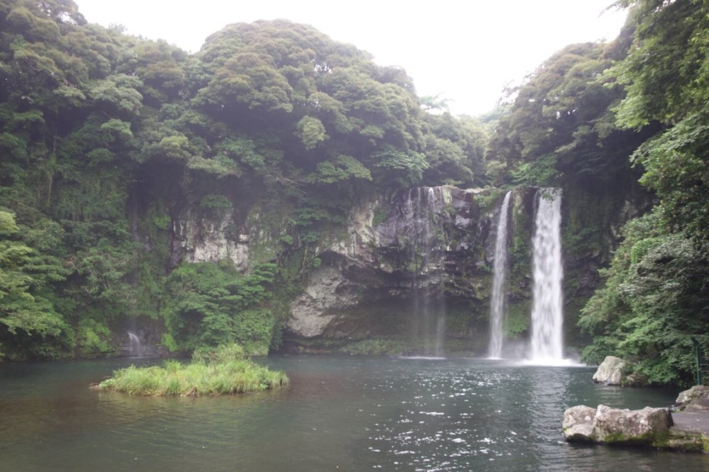 Estamos já na costa sul, onde fica Seogwipo-si, a segunda cidade da ilha, depois de Jeju-do. É aqui que está uma mão cheia de fenómenos geológicos e naturais, que fazem de Jeju uma ilha especial e muito desejada. Perto da praia de Jungmun estão as Cascatas Cheonjeyeon, muito bonitas e envolvidas na luxuriante floresta subtropical, cortada por um rio onde estão 3 quedas de água. A primeira delas é na verdade apenas um lago com uma cor irreal, mas talvez em épocas de chuva mais abundante possa ter a companhia de uma cascata. Diz a lenda que as fadas costumavam descer do céu para aqui tomar banho.