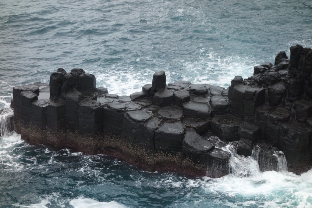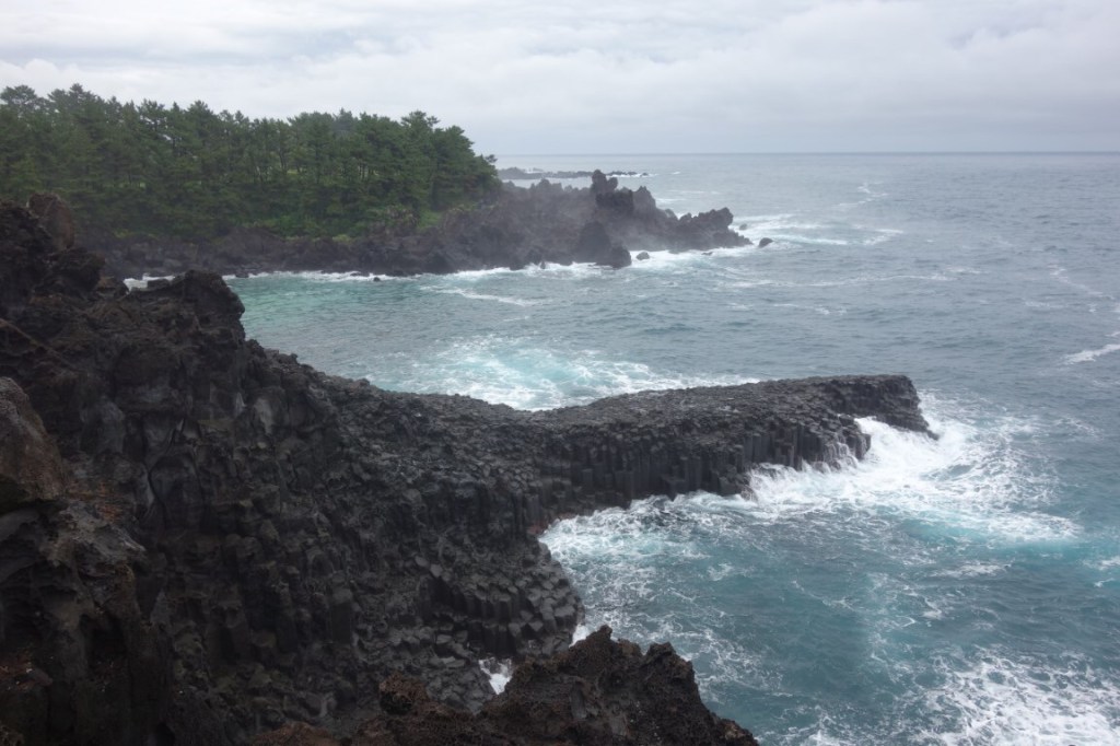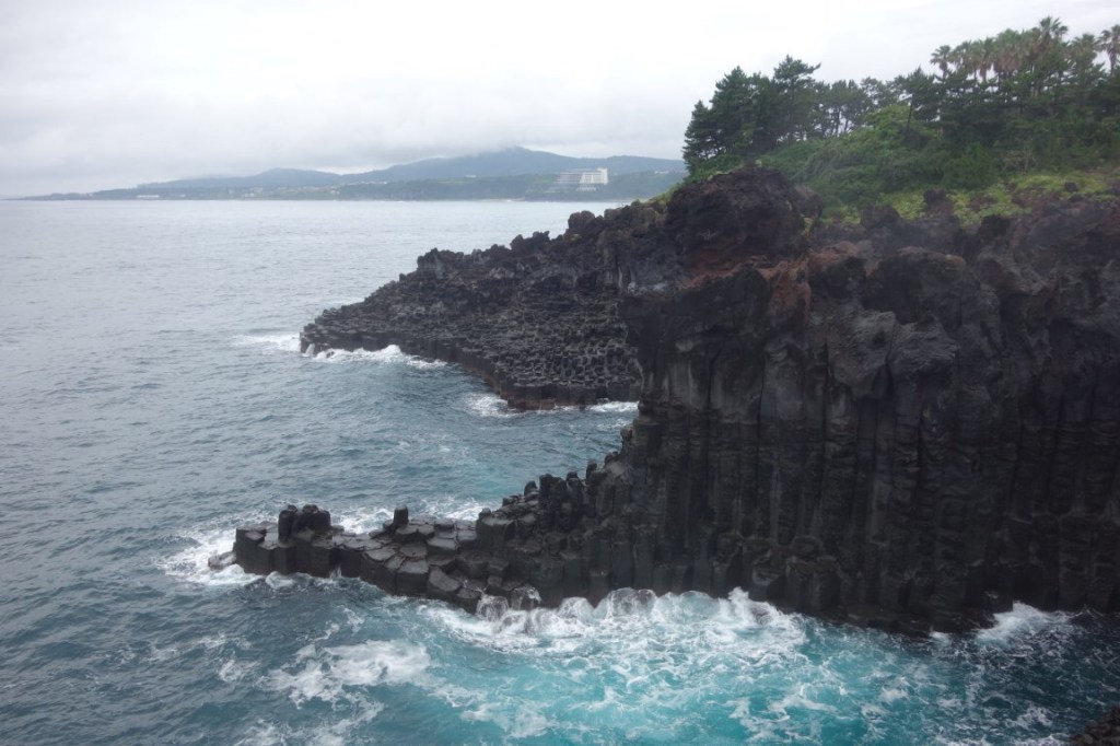 As colunas de basalto de Jusangjeolli não andam longe, mais uma das imagens de marca de Jeju. Ao longo de cerca de 2 kms da costa Jungmun Daepon, as falésias apresentam-se com riscas nas paredes rochosas, as “jeolli”, em coreano. Estas escorrências são o resultado da contracção da lava, em virtude do rápido arrefecimento das suas altas temperaturas, fenómeno formado há 250.000 a 140.000 anos. Veem-se cortes verticais, bolinhas e outras formas diversas que a rocha basalto tomou.