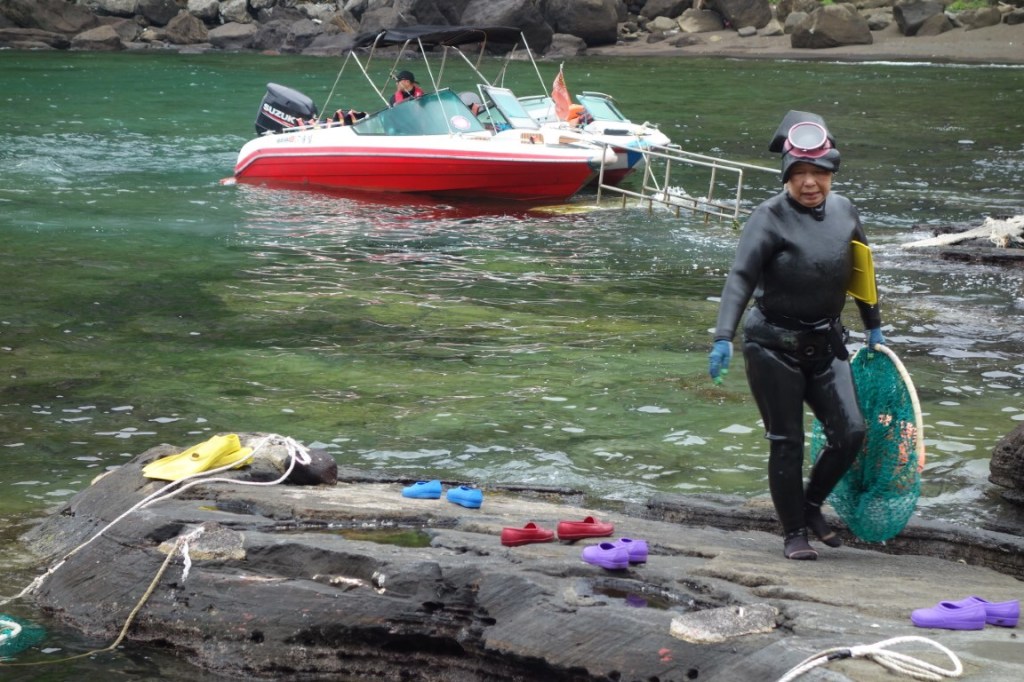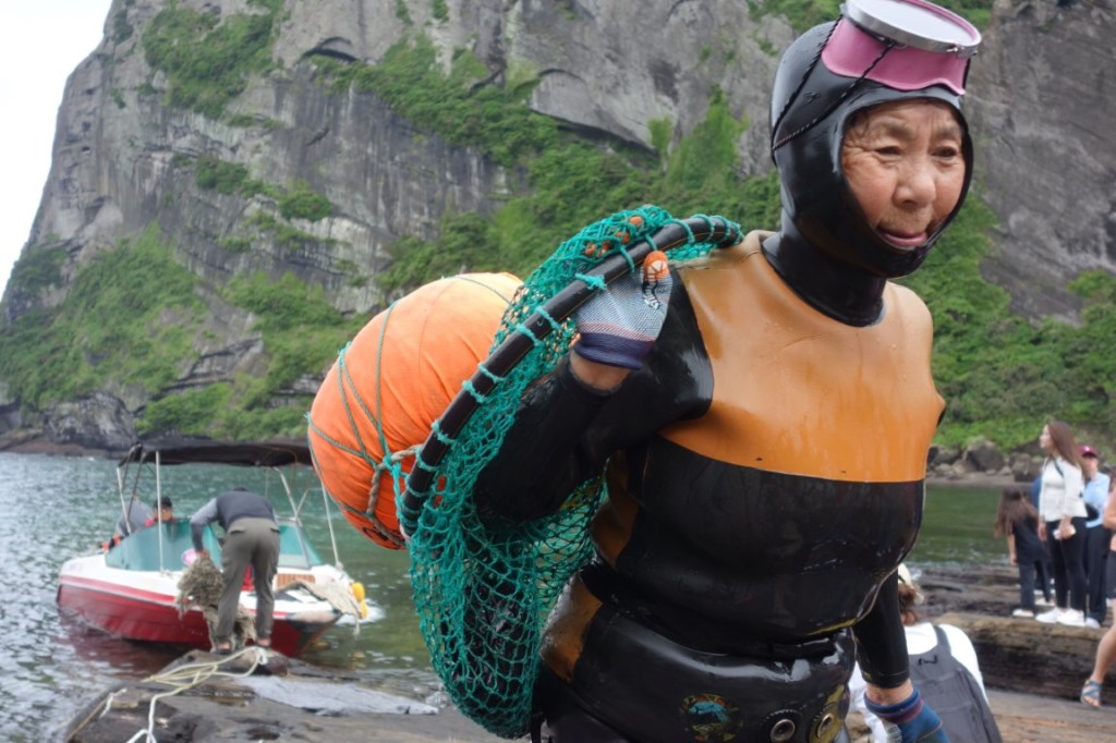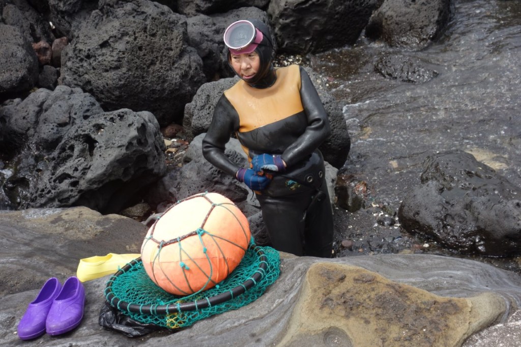 Há todo um ritual associado aos mergulhos das haenyeo, iniciando o seu aquecimento prévio à entrada no mar em santuários próprios, onde executam ritos de influência xamânica em honra da deusa do mar e cânticos. As suas melodias estão ligadas ao ritmo das ondas do mar e são maioritariamente lamentos pelas suas vidas, maridos e governo. E os seus instrumentos de trabalho e roupas são simples e artesanais, um fato de mergulho, óculos, bóia, rede e uma faca (bitchang) para retirar o marisco das rochas. Pescam especialmente ouriços do mar e abalone, mas também polvo e outros. E conseguem mergulhar até 13 metros de profundidade aguentando a respiração por 2 minutos. Sem artifícios para além dos mencionados. É obra. A performance a que assistimos, com o Seongsan Ilchulbong e muitos turistas como testemunhas, é inspiradora e, para além de todas as palavras, gera um nós um respeito imenso por estas mulheres, com muitas décadas de vida árdua, símbolo da cultura e tradição de um povo. Só por elas, Jeju merece uma visita.